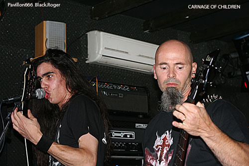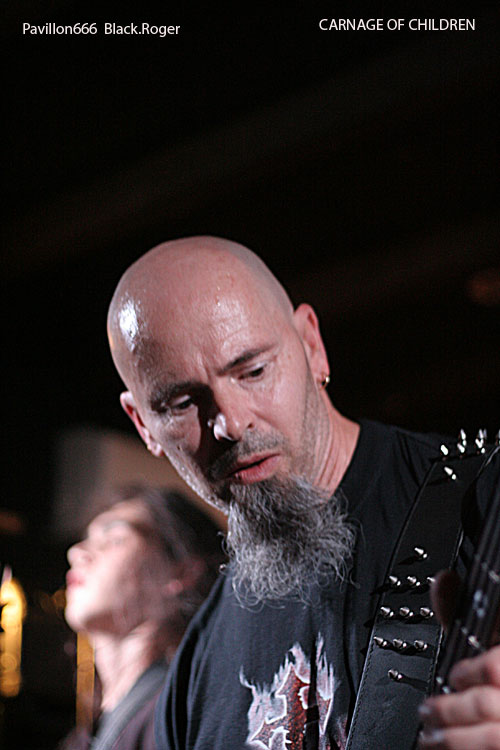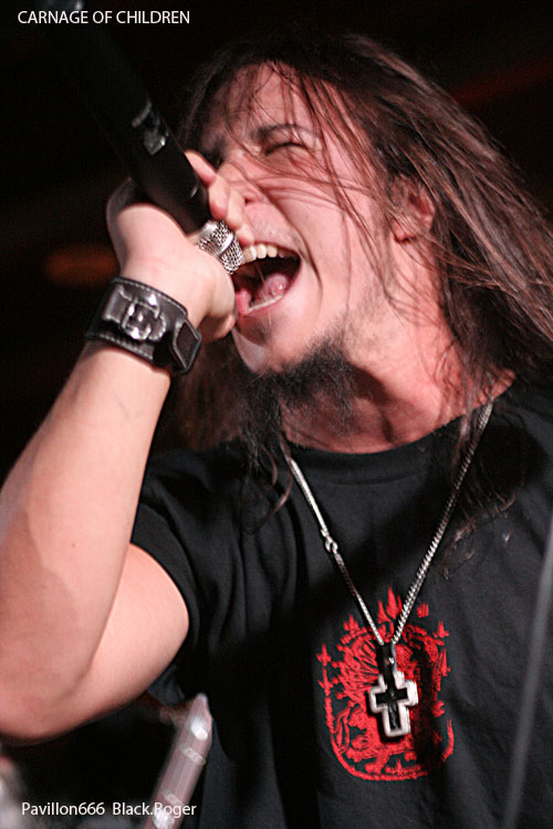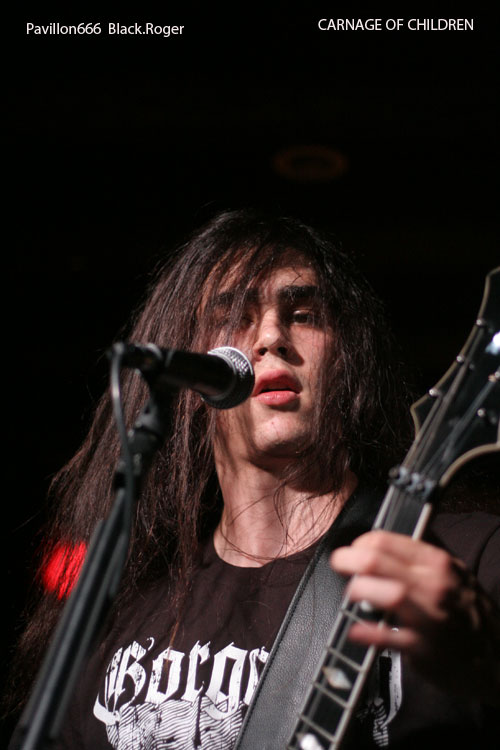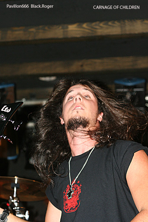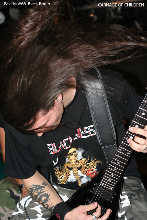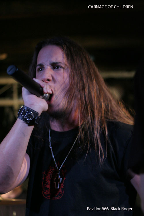 Que le bal musette métal commence, dans cette salle bien remplie pour l’occasion, ça fait plaisir, l’ambiance semble être au rendez-vous. Vingt heures trente et des poussières, CARNAGE OF CHILDREN ouvre le feu avec son death lourd, brutal et technique à la fois, mélangeant des bonnes influences de CANNIBAL CORPSE et DEATH entre autres, le décor est planté.