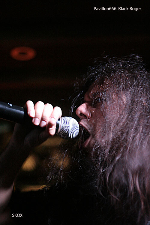 L’heure tourne, et SKOX va sûrement nous achever maintenant avec son thrash/death énergique qui vous écorche les neurones avec leur hargne et leurs riffs énervés. Les titres de leur dernier EP comme « Destruction » et « Internal Burns » mettent le feu aux poudres. Et c’est parti devant la scène pour les défoulements et « bourrinages » classiques provoqués par les brûlots que le quintette nous envoie en pleine face. J’ai bien dit quintette, car maintenant SKOX a recruté un second guitariste ce qui donne plus de poids et d’envergure à cette prestation scénique. C’est encore plus costaud et efficace. J.C. avec sont chant brut de décoffrage nous rappelle bien sur le old-SEPULTURA et TESTAMENT, que du bonheur en somme. Les morceaux sont bien construits et se développent en riffs tranchants dans le vif du sujet et soli meurtriers et vicieux, comme on aime dans ce style, surtout avec une section rythmique composée d’une basse bien présente et d’une batterie très carrée, machine de « killer » tout simplement. Leur mélange thrash et death bien dosé met d’accord tout le monde dans ce Warmaudio bien chaud évidemment où l’ambiance métal des bons concerts est palpable et conviviale au possible. Allez, un dernier boulet bien speed pour la route et SKOX rend les armes. On en aurait bien repris une louche, c’est certain. Alors, à très vite les thrashers, vous revenez quand vous voulez nous défoncer la cervelle, on aime ça, vous vous en seriez douté vu l’accueil de ce soir.