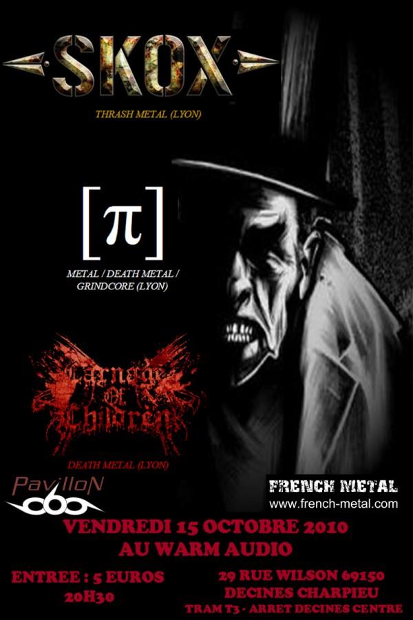Après les soirées black-métal Lyonnaises de ces derniers temps, le death/thrash repart à l’assaut dans l’agglomération. SKOX organise donc ce Vendredi 15 Octobre une petite soirée brutale au Warmaudio de Décines. Le groupe va jouer en compagnie de PI et de CARNAGE OF CHILDREN, formations locales qui ne demandent qu’à en découdre sur les planches actuellement.