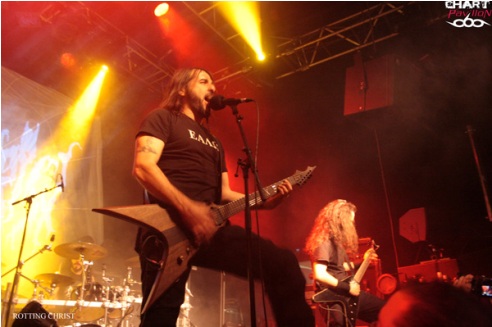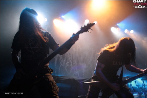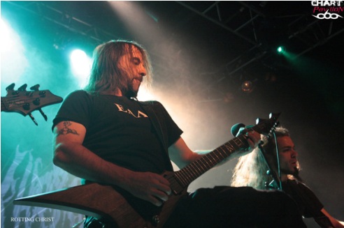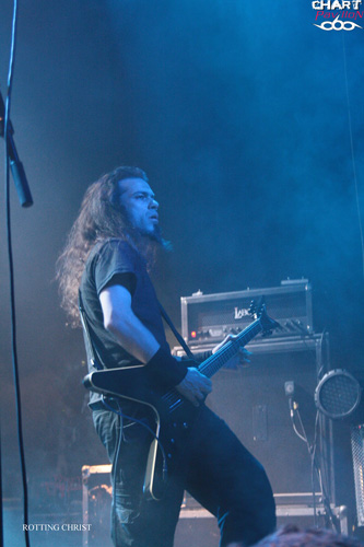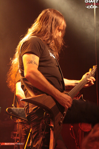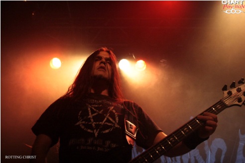 Première grosse pointure de la soirée, ROTTING CHRIST. Ces grecs là écument les scènes européennes depuis prêt de 20 ans et une telle longévité, c’est déjà une preuve de qualité. Le groupe ne semble pas avoir encore dépassé le stade qui les ferrait arrivé en tête d’affiche et doit se contenter d’une place moins prestigieuse. Peut-être est-ce du à des albums parfois discutables dans certains choix artistiques mais en aucun cas cela ne peut être mis sur le dos des prestations scéniques du combo. Celui qui n’a jamais vu ROTTING CHRIST sur scène ne sait pas ce qu’il rate et celui qui les a déjà vus ne peut qu’en redemander. La tournée promotionnelle pour l’album « Aealo » suit son court mais le groupe n’hésite pas à piocher dans ses précédents opus et interpréter des morceaux tels que « King Of A Stellar War » ou « The Sign Of Prime Creation ». Mais ce qui fait toute la force de ce groupe hormis de très bons titres, c’est le dévouement absolu de Sakis à ce qu’il fait. Son énergie et son charisme sur scène est vraiment impressionnants. On n’a pas d’autre choix que de rentrer à 200% dans sa musique. Mettez n’importe qui d’autre à sa place et le groupe perdrait une grande partie son intérêt. C’est lui qui fait ROTTING CHRIST, certainement modestement mais dévoué jusqu’au bout. On ne peut que se satisfaire et apprécier ce que cet homme à apporter. Dommage que le groupe n’est pas disposé d’un peu plus de temps…