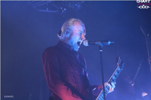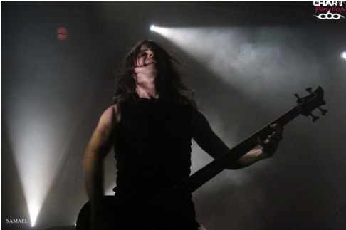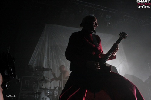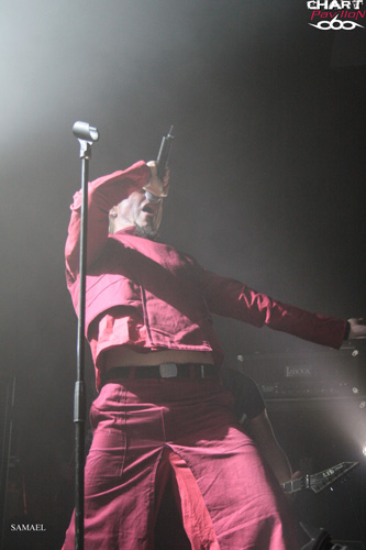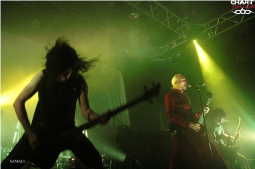 Changement radical d’atmosphère avec l’arrivée de SAMAEL. L’ambiance à tendance à se refroidir légèrement après la claque donnée par ROTTING CHRIST. La musique de SAMAEL est nettement moins organique et la transition a un peu du mal à passer. De plus, le peu de temps entre les groupes jouent cette fois en la défaveur de l’affiche. Il faudra un peu de temps avant de s’immerger totalement dans ce set. Une fois la froideur apparente vaincue, La musique de SAMAEL s’impose à vous. On est pris dans ces sonorités qui mélangent à la fois metal extrême et musique électronique complexe. On compte quelques classiques dans cette set-list tels que l’incontournable « Rain » mais aussi le dernier paru « Antigod » qui prend une toute autre dimension en live. SAMAEL est actuellement sur l’écriture d’un nouvel album qui devrait voir le jour courant 2011. Le groupe en profite pour nous présenter un nouveau venu qui confirme le fait que l’album « Above » était bien un retour temporaire aux sources et au black metal en particulier. A l’instar de ROTTING CHRIST, SAMAEL est lui aussi doté d’un frontman hors paire. La présence scénique de Vorph est indéniable. Même Xy bien caché derrière ses claviers dégage un charisme incontestable. Dommage que celui-ci n’utilise pas un peu plus ses percussions car cela apporte un énorme plus sur les morceaux, un son acoustique qui manque parfois au groupe. On n’évoque à peine le plus visuel qu’apporte ce musicien lorsqu’il se met à frapper comme un forcené ses percussions. Là encore, le set est un peu court et on a l’impression que cela passe à la vitesse d’un TGV. Cela fera donc partie des groupes à revoir sur une prochaine tournée.