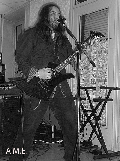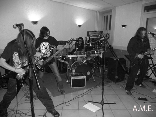 Ce sont leurs amis de A.M.E., des Grenoblois eux-aussi, qui vont leur succéder devant un public certes restreint, mais attentif et connaisseur. A.M.E., plus exactement "Admortemeternam", est un groupe de quatre musiciens, apparemment très soudés, qui a vu le jour en 2009, né de la disparition d'une formation de black-metal. Le line-up et l'orientation musicale ont été profondément renouvelés. A.M.E. se veut atypique et original en pratiquant un death "psychédélique", semblable à aucun autre. Le thème dominant est la psyché humaine, il est bien connu que l'âme humaine (jeu de mots ?) est souvent "malade". Quoi qu'il en soit, chacun des membres du groupe y met un peu de lui-même, revendiquant des influences fort éclectiques, de TREPALIUM à UNLEASHED et autres. On passe du rapide au plus lent, les deux chanteurs se relaient, en parfaite symbiose, les mélodies sont un brin « ensorcelantes », « ça fait ambiance ! », chuchote quelqu'un derrière moi. Soudain une voix gutturale et des riffs plus incisifs, mais l'ensemble reste harmonieux, esthétiquement de haut niveau. On conclura le set par une reprise de SEPULTURA ("Refuse/Resist). Il est 22h, les amateurs de pogo patientent en attendant les deux groupes plus "brutaux", à savoir CARNAGE et THE OATH... Grenoble, ville universitaire, produit des scientifiques et des littéraires de haut niveau, mais aussi des musiciens talentueux, et parfois ce sont les mêmes...