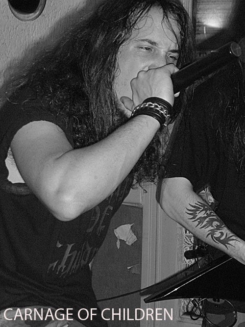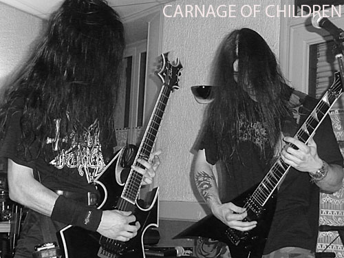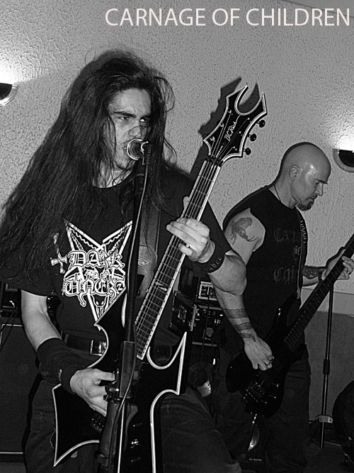 A partir de 22h30, nous aurons affaire à nos cinq "guerriers" de l'Est lyonnais, CARNAGE OF CHILDREN. Ils sont venus en voisins nous faire une démonstration de ce que je pourrais appeler du "death metal « old school ». On n'y va pas de main morte, chaque seconde compte. Quelle énergie, quelle puissance ils dégagent ! Et quelle voix, cet Alex qui n'a pas un instant de répit, qui se déplace de droite à gauche, tantôt vers Hugo, tantôt vers Gary ou vers Pascal, le mentor et l'âme du groupe dont la cohésion est essentielle à la qualité de leur musique en live. Quant à Anthony, le batteur, il est toujours discret et efficace derrière ses fûts. Une réelle émotion est suscitée par les nouveaux morceaux en particulier, "Souls' River», "Way of Darkness", chanson-titre du premier album dont la sortie est prévue pour le printemps, sans oublier "Destroy The Invader". Cette émotion explique l'attitude de ceux qui sont là, devant eux, et qui tentent de se déchaîner en dépit de l'exigüité de l'espace. La dernière chanson -à trois voix-est particulièrement belle. En alliant la passion, le talent et le sérieux, un groupe est assuré de son succès. Ce fut leur cas ce soir. D’autres concerts sont prévus dans la région, avant et après la sortie de l'album.