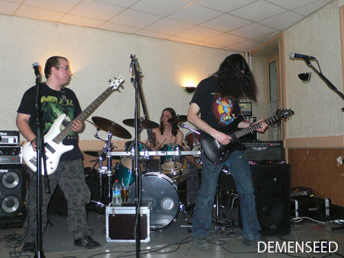 C'est le Café de la Poste à La Verpillière, dans le Nord-Isère, qui ce soir, samedi 12 février, servira de cadre à un concert de death-metal, a priori sans prétention, organisé par le groupe dauphinois DEMENSEED et où se produiront trois autres formations régionales, de Grenoble et de Lyon. On devine d'emblée que l'affluence sera modeste, mais on est réconforté par une ambiance chaleureuse et conviviale, perceptible avant même le début des opérations. On est là entre amis, pour beaucoup. Il n'y a pas de scène, le matériel, les musiciens et les spectateurs -essentiellement des métalleux convaincus et passionnés- sont au même niveau, dans un espace réservé aux concerts. Il est 20h10 lorsque les quatre musiciens de DEMENSEED, des Grenoblois dont la notoriété ne pourra que croître, donnent le coup d'envoi de cette soirée. Leur line-up comprend notamment une guitariste de talent, Lucile, et un claviériste, qui n'interviendra pas ce soir. DEMENSEED, fondé en 2007, est issu de l'ex-groupe DREAMS REFLECTION. Il pratique aujourd'hui un death metal progressif tout à fait honorable et original. Ils ont une démo à leur actif (2009). Le frontman, chanteur-guitariste, ne manque pas de qualités, vocales surtout, les guitares produisent un son puissant et agréable à l'oreille, assez varié, dans une atmosphère presque intimiste, ponctuée d'applaudissements nourris. Mais on a l’impression, au bout de 5 morceaux, qu’un incident technique vient perturber le set. Dommage, une corde de guitare cassée, grosse déception de part et d’autre, mais inutile d’insister, il vaut mieux écourter la prestation qui n'aura duré qu'une demi-heure. C'est une sorte d'injustice. Les gens de DEMENSEED, sympathiques et prometteurs, auront l'occasion de "se rattraper" le 26 mars prochain lors d'un concert au Metal Café de Lyon. On leur souhaite bon vent.