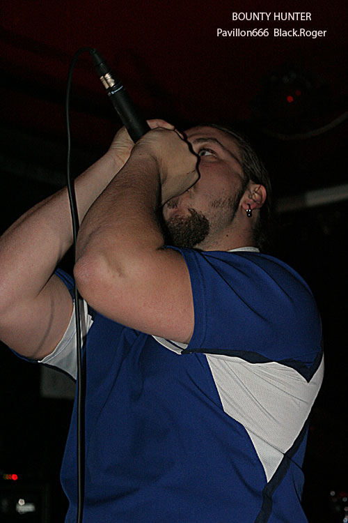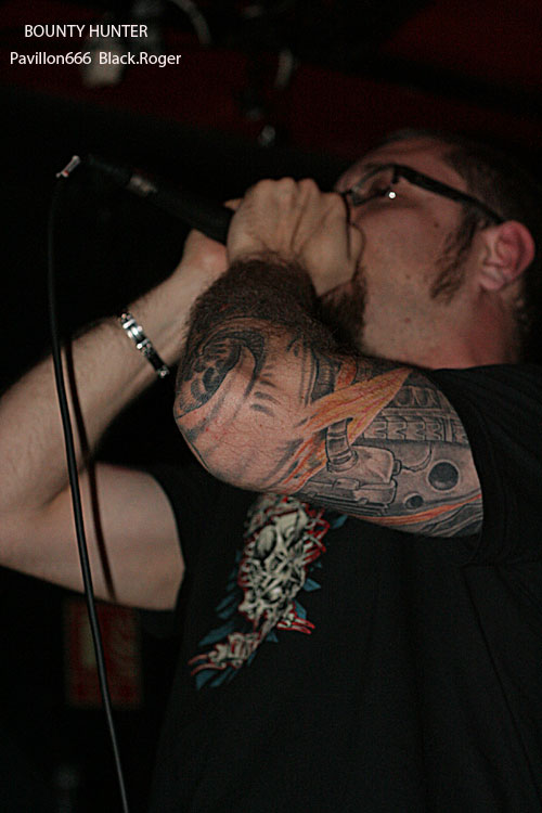 Evidemment il ne manquait plus à l’affiche que les Lyonnais de BOUNTY HUNTER pour nous envoyer du bon grindcore à la figure et les rouleaux de papier toilette également tradition oblige. Comment ? Là devant moi quelqu’un qui ne connaissait pas encore ce groupe qui à sorti son premier album « The True Bounty Hunter Picture Show » il y a peu lors d’une « fiesta » mémorable Ô Totem de Rilleux ? Faute avouée est à moitié pardonnée, on ne dira rien pour cette fois. Alors ce soir BOUNTY HUNTER a la forme, le son un peu moins, en effet les voix des deux « growlers » sont bien distinctes, la basse turbo fait trembler le navire par son omniprésence au détriment de la guitare perdue au fond du Rhône ». Mais bien vite l’ambiance s’installe avec les titres courts, provocateurs, et les coups de boutoir efficaces des compositions annoncées par les samples d’extraits de films. Alors, devant la scène et dans toute la péniche, c’est un joyeux « bordel » qui s’installe avec en écharpe le fameux papier « Q ». BOUNTY HUNTER, malgré la dynamique de ses morceaux, s’apprécie surtout en live, et ce soir encore une fois, nous n’avons pas été déçus du voyage hybride death/punk/grind/core, c .q.f.d.