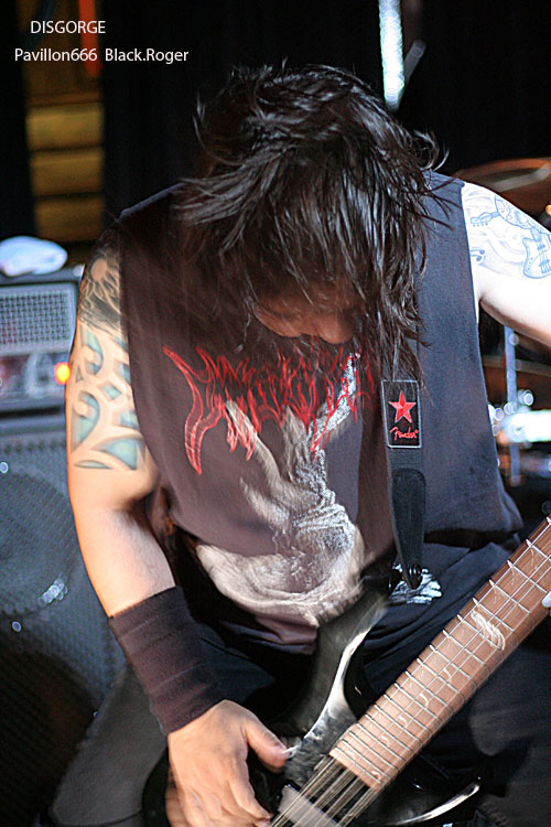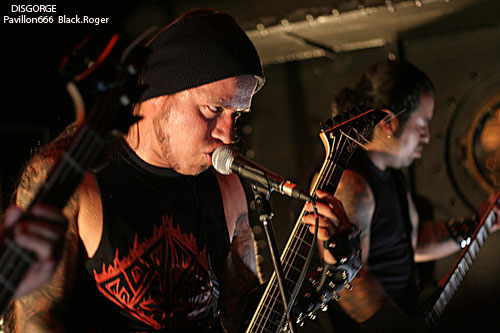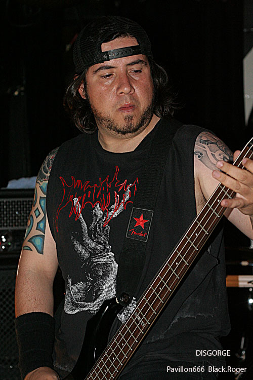Passons maintenant à la tête d’affiche de la soirée, les fameux Mexicains ayant acquit une place “culte” dans le grind/death depuis longtemps déjà. Je veux parler bien sûr de DISGORGE. Alors, il va se passer quelque chose de vraiment troublant durant leur set. En effet, nous allons recevoir dans la tête un train lancé à grande vitesse avec la violence technique et morbide du quatuor. DISGORGE, c’est vraiment le style « char d’assaut » avec blasts incessants, riffs meurtriers et malsains, ambiance mortuaire, gore, à l’extrême de l’extrême, bref je ne vous fait pas un dessin. Et le public dans tout cela reste statique, blanc comme un cierge de pâques, comme pétrifié par tant de débauche musicale, comme incapable de remuer tellement son esprit semble saturé de « vomis » malsains, de hurlements « guitaristiques » et de basse vrombissante accouplée à une batterie en folie ». Et puis, c’est un comble, progressivement la péniche se vide inéxorablement, il ne reste plus qu’une cinquantaine de personnes figées, comme assommées par le déluge sonore, pourtant c’est DISGORGE que diable, avez-vous peur ? Mais les irréductibles en veulent encore, incompréhensible, alors nos amis Mexicains reviennent par deux fois en rajouter une couche bien pimentée. Prestation mortelle qui tue la mort, DISGORGE n’a pas faibli ce soir et fut excellent, nous donnant rendez-vous au prochain Hellfest naturellement, quant au public…