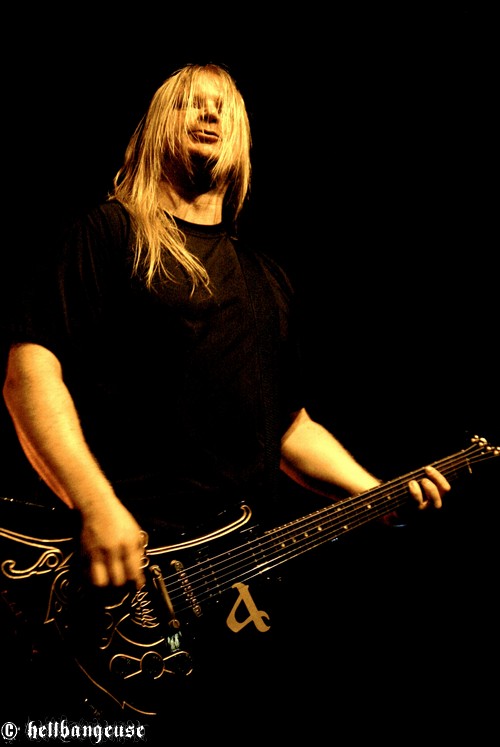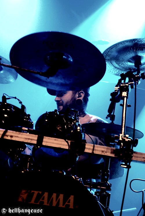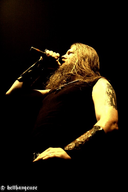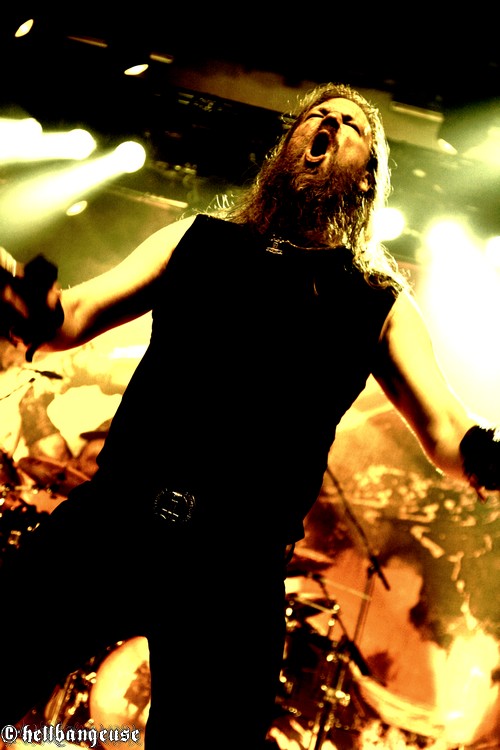 Changement de décors, montée en flèche de la température, cris délirants dans la fosse : AMON AMARTH prend possession du Bataclan. Pour bien commencer et placer cette soirée sous le signe du dernier « Surtur Rising », c’est le magistral « War of The Gods » qui inaugure le spectacle. La voix de Johan Hegg raisonne comme celle d’un roi en son royaume ; puissante et charismatique, elle ne met pas longtemps pour enflammer la fosse. Le public bouge dans tous les sens et les cheveux tournoient allègrement, savourant cette déferlante musicale d’une qualité mémorable. Rien ne dépasse, tout est exécuté au millimètre près et l’on se retrouve donc devant un son d’une qualité studio emporté par l’émotion du live. Johan Hegg, en bon chef de guerre, sait manier ses troupes entre les morceaux grâce à une voix rocailleuse qui en impose autant que sa physionomie. Pour pousser le vice un peu plus loin, son rire démoniaque vient ponctuer de temps à autre ses sympathiques interventions ce qui a pour effet d’électriser automatiquement la fosse et relancer inlassablement les pogos. Mais malgré cela, on sent ce soir un certain automatisme dans la prestation d’AMON AMARTH, un léger manque de spontanéité qui tend à rendre certains instants presque plats ou prévisibles. Toutefois, la grande expérience des vikings suédois fais vite passer cette impression au second plan, notamment grâce à une set-list en béton qui en laisserait rêveur plus d’un (« With Odin on our Side », « Guardians of Asgaard », « Slaves of the Fear », « Twilight of the Thunder God » et bien d’autres encore…). Comme toujours le temps passe à une vitesse affolante et après presque une heure et demie de show parfaitement exécuté, il est déjà l’heure pour AMON AMARTH de se retirer et de reprendre la route pour satisfaire de nouvelles masses affamées de combats sanglants.
