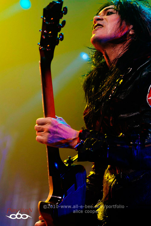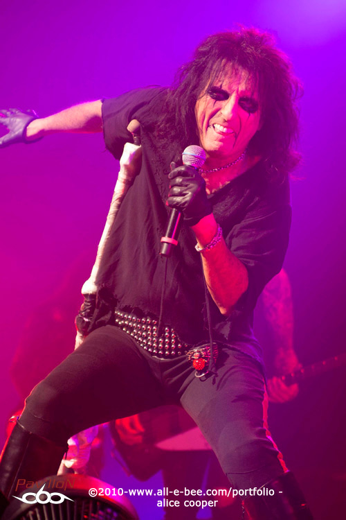 21h00 tapantes, le show d’Alice peut enfin débuter. Pas de décor « extra ordinaire » même si on retrouve largement l’esprit horrifique du groupe. Par contre, attendez vous à un show efficace et parfois très rentre dedans avec des rythmiques endiablées. Coté batterie, on notera par moment de véritables petits festivals, quand au chanteur…et bien comme je le surlignais en préambule, Alice n’est pas près de mourir. Sur chaque titre du show, on a droit à un objet « artifice » dont Alice Cooper joue sans retenue : guillotine, corde de pendaison, chaise roulante, poupée gonflable, colliers de perles et billets de banque jetés sans retenue dans le foule, et également des jouets « humains », comme des esclaves masculins et une danseuse/infirmière qui n’oubliera évidement pas de pousser le fauteuil roulant d’Alice,  de faire un strip-tease derrière un écran en ombre chinoise ou de se masturber avec une disqueuse...Peu importe les instruments, Alice se relèvera toujours, et dirigera le show de main de maitre, avec sa cravache légendaire. Son très bon (mais jamais excellent dans cette salle), lumières toujours en osmose avec le décor et les titres, musiciens hors pairs, bref tout est réuni ici pour avoir un show typique US qui restera gravé en mémoire, tout comme certains titres joués ici : « Poison », « Feed my frankenstein », etc. Le public est très réceptif et l’ambiance générale restera bon enfant avec les frasques sans cesses renouvelées du soixantenaire immortel.