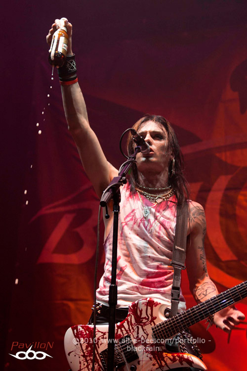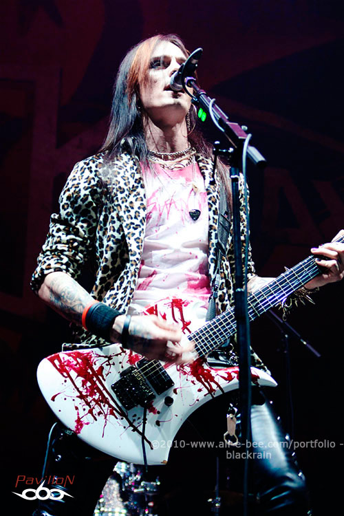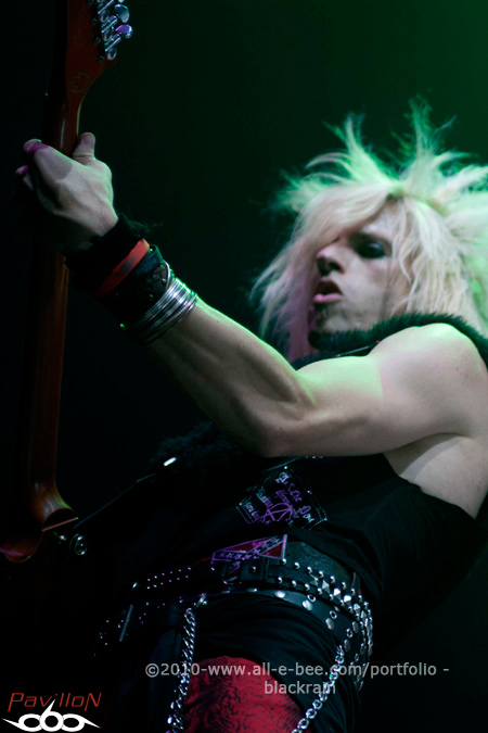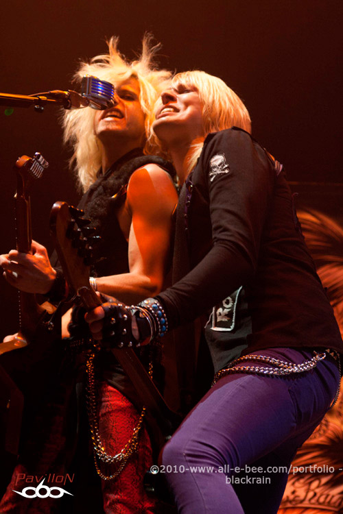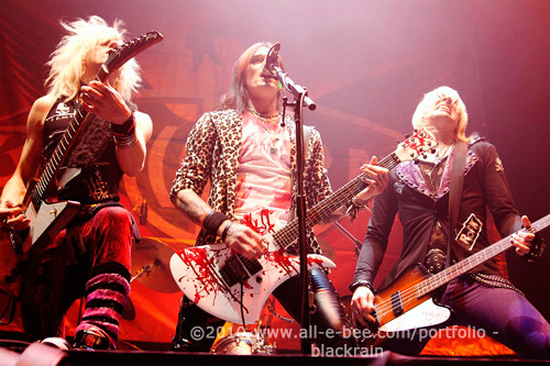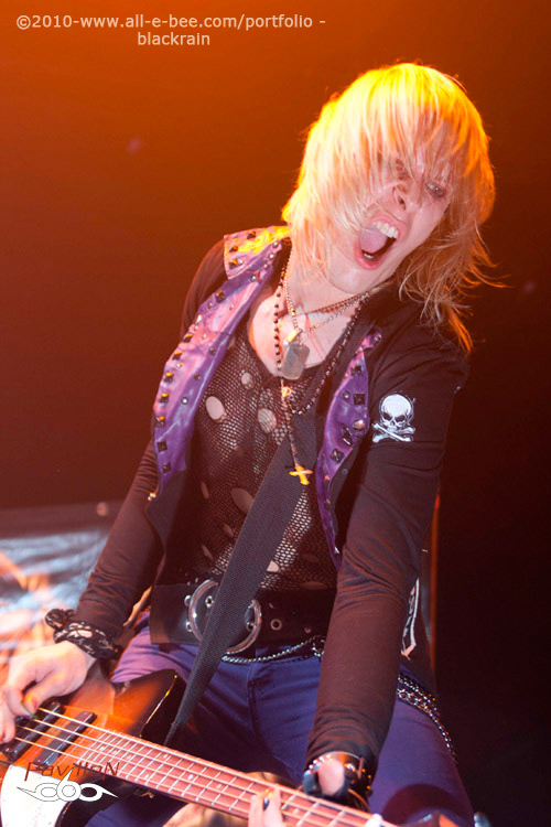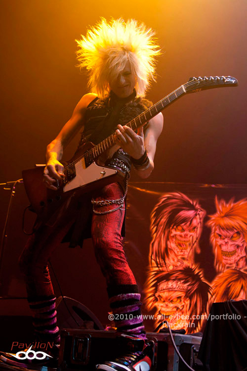 Mais avant Alice, il y a la première partie, qui s’avère être LE groupe en vogue ces derniers temps, et qui vient tout juste de signer sur Listenable record : les haut savoyards de BLACKRAIN. Le concert débute à 20h00 tapantes, tout est parfaitement calibré coté timing ce soir. Le combo, orné de tenues pour le moins « cheap », sort tout droit des années 80’s, et nous proposent un metal typé hard rock glam, tiré de Guns n’roses et autres L.A.Guns. Le groupe au fur et à mesure de leur prestation, obtient le soutient du public qui est subjugué par tant d’énergie et de talent. Les solos de guitares sont souvent présents, le chant est parfait et on notera une petite ressemblance avec Sebastian Bach (Skid row) tout du moins pour le physique. Tout est parfaitement maitrisé et toutes les compos font mouche, avec des rythmiques et des refrains imparables. Très bon mouvements et jeu de scène, on sent une envie d’en découdre et une bonne osmose entre les membres, un vrai bon show à l’américaine pour ces français qui méritent largement le soutient du public. Encore un Cocorico !