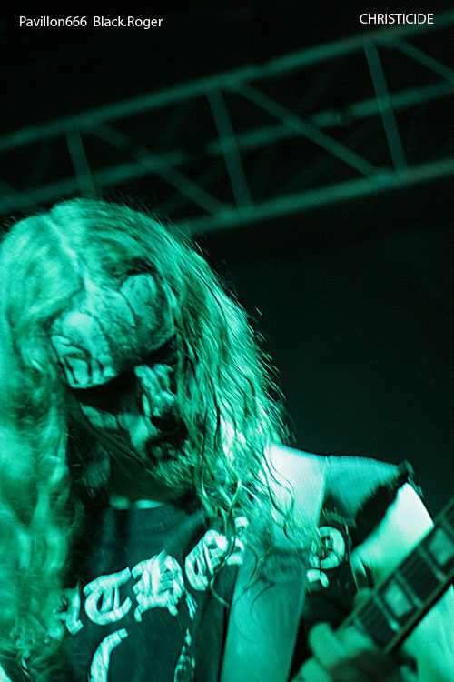 CHRISTICIDE, ce nom vous est sûrement depuis peu devenu familier dans la mouvance française de black métal qui se veut innovant. C’est donc au tour de cette formation de monter sur les planches du Lyon’s Hall pour clore cette sombre nuit malsaine à Lyon. La musique de CHISTICIDE possède un atout qui ressort dès les premiers titres, c’est un son assez hypnotique avec  ces riffs incessants qui  vous érafle l’esprit avec une rythmique ébouriffante et implacable.  On nous met à bout de souffle avec des blasts permanents certes, mais avec une intrusion de mélodies déstabilisantes cachées au milieu de ce déferlement sauvage dans la plus pure tradition du black des 90’s. Et forcément à certains moments on pense à WATAIN, mais cela reste fugace car CHRISTICIDE a forgé depuis maintenant dix ans sa propre identité reconnaissable par tous les amateurs de « true » black. Ceux des premiers rangs vont manifester physiquement leur adhésion aux compositions du groupe et l’ambiance se révèle positive en cette fin de soirée. Le groupe, malgré un son un peu grésillant, a satisfait de belle façon nos attentes, excellent tout simplement.