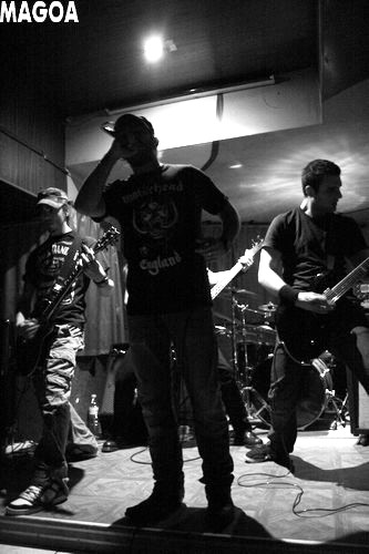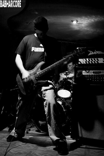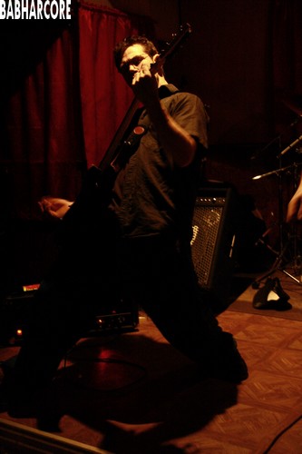 L'attente d'une éventuelle arrivée en masse du public, presque vaine, retarde le début du set de BabHarCore qui commence ainsi avec près d'une heure de retard. Le quartet, privé de bassiste pour le moment, délivre un Frenchcore bourrin au chant presque rapé par instants, dont les paroles déclamées en français ajoutent une petite touche supplémentaire à l'identité du groupe. Quelque peu déçus du manque d'enthousiasme d'un public déjà peu garni, BabHarCore n'abandonne tout de même pas la tâche et nous assène sa musique en pleine poire, élevée par un batteur au niveau appréciable qui sait parfaitement mener la danse et s'impose tout naturellement comme l'homme de la situation. Pour le reste de la bande, même si la qualité sonore est loin d'être au rendez-vous, la gestuelle n'est pas en reste. Les deux guitaristes et le chanteur s'agitent dans tous les sens sur cette scène trop petite pour eux et manquent par plusieurs fois de se piétiner les uns les autres. La fosse, ou ce qui y ressemble, peine quant à elle à se montrer tout à fait convaincue par le set de ce premier groupe, la faute à un style qui appelle par moments quelques sonorités néo-metal et à un son encore un peu trop brouillon. Défauts excusables me semble-t-il si on replace le groupe dans son contexte, ce qui permet de trouver la prestation appréciable.