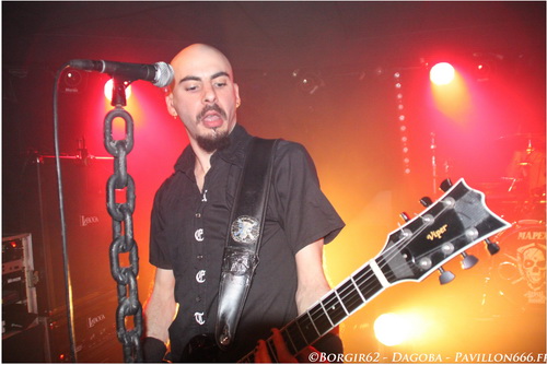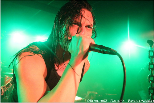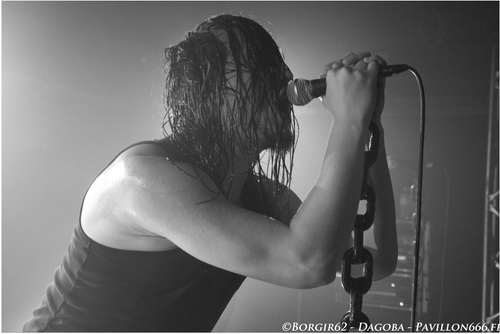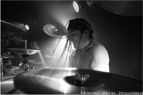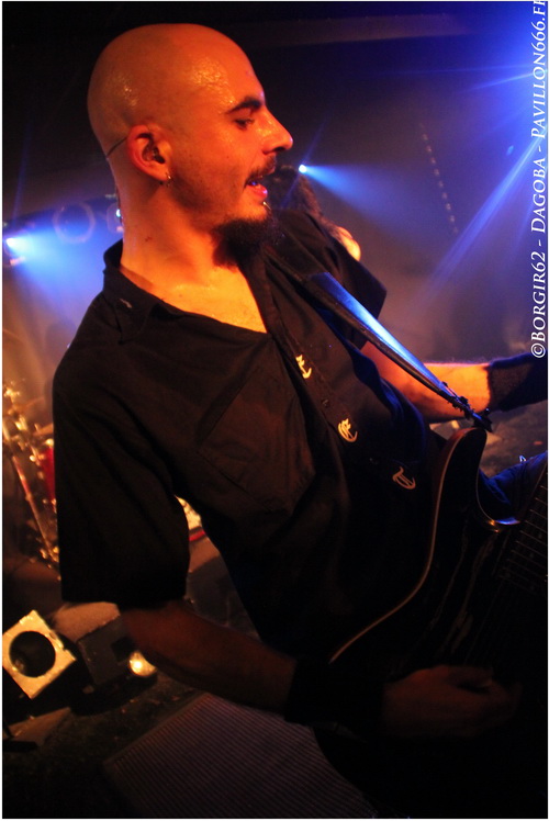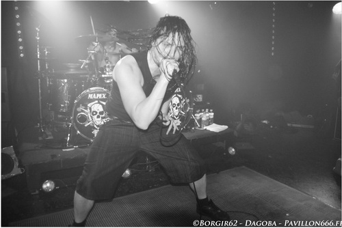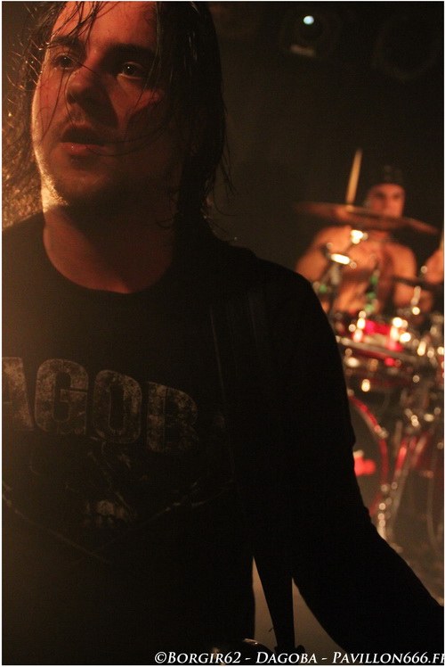 Enfin, Dagoba arrive ! Nous allons pouvoir apprécier le concert à sa juste valeur. Le public s'est considérablement avancé au bord de scène, et rester au premier rang est désormais une lutte, et le sera tout au long du concert. Car le public de Brétigny-sur-Orge est ce soir en très grande forme, tout comme Dagoba. Les Marseillais vont nous balancer un set, qui, bien que sans réelle surprise, va relever du génie. Ouvrant sur "Dracula" puis sur "There's Blood Offshore", le quatuor met dès ces premières minutes le feu dans la petite salle du Rackam. Tout comme sur les précédentes dates, le groupe phocéen va revisiter ses 3 derniers albums Poséidon, Face The Colossus et What Hell Is About, et enchaîne donc avec l'incontournable et exceptionnelle "The Man You're Not". Et là, l'ambiance monte encore d'un cran et les pogos se multiplent. Les rares fois où ils cesseront, ce sera pour laisser la place aux circles pit et aux wall of death, qui vont épuiser un public qui ne demande que ça. Avec un Werther survolté, qui arpente non-stop la scène, un Izakar qui n'est pas en reste et un Shawter qui est un vrai chauffeur de salle, Dagoba impressionne son petit monde. Et que dire de Franky Costanza, qui n'hésite pas à haranguer le public entre 2 morceaux, mais en a-t-il vraiment besoin quand on on voit toute l'énergie qu'il déploie derrière les fûts ? Comme d'habitude, les fans de Metal Extreme en auront aussi pour leur compte, puisque Dagoba nous dédiera le morceau le fantastique "It's All About Time". Tout y est, que ce soit la prestation scénique, la qualité du son, l'ambiance, la communication avec le public, le plaisir, tout ! Nous aurons même le plaisir de voir Anthony Dubois a.k.a ROOTS_VC, photographe bien connu, hurler sur "Degree Zero".