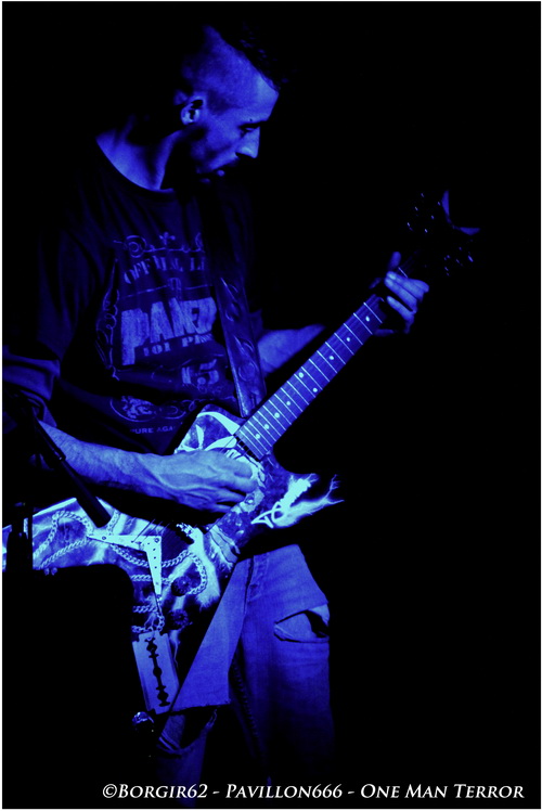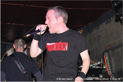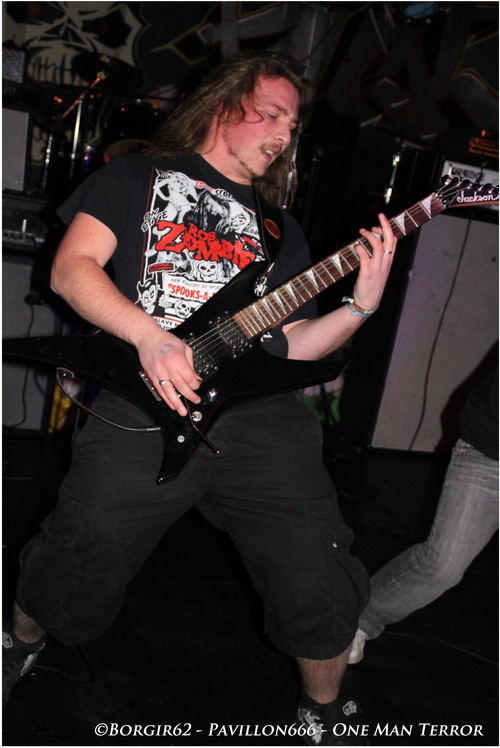 ONE MAN TERROR a le privilège d'ouvrir pour cette soirée et peaufinera pendant de longues minutes ses réglages. Le concert démarre donc en retard, mais c'est rarement un problème à l'Igelrock (et ça ne le sera d'ailleurs pas ce soir), et c'est un mal pour un bien, cela permettant à quelques retardataires d'arriver avant le début du set. Malheureusement, cette application ne sera pas récompensée puisque le son laissait à désirer, notamment en ce qui concerne les guitares, audibles principalement dans les graves. De même, le chant de Jimmy souffrira de ce son assez médiocre il faut l'avouer. Néanmoins, Jimmy nous montrera qu'il maîtrise assez aisément le chant thrash, et les growls de son acolyte, Rems, sont bien portés. Les premiers titres sont réussis, et les influences thrash sont bien présentes. Mais voilà, à la longue, les morceaux se ressemblent un peu trop, et les riffs, un peu trop classiques ne permettent pas une réelle liberté au niveau des compositions. Le groupe se cantonne à des basiques établis il y a pas mal d'années par des groupes cultes (Pantera par exemple) et une certaine lassitude commence à gagner quelques spectateurs. Il ne manque donc que la créativité pour que le groupe se lâche un peu plus dans ses compositions comme sur scène, et pour que l'on puisse davantage apprécier cette première partie qui, soyons honnête, nous aura permis de nous mettre dans le bain (même si le style ne collait pas du tout avec ce que nous proposerons les deux autres formations).