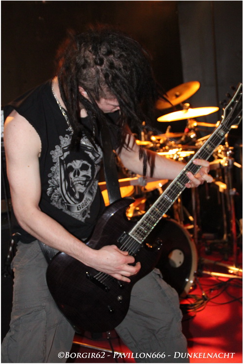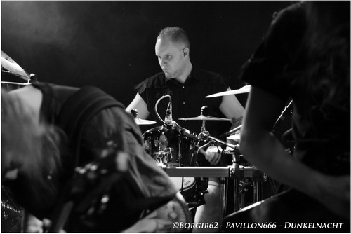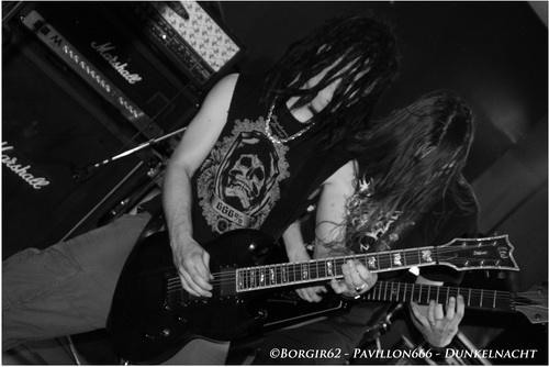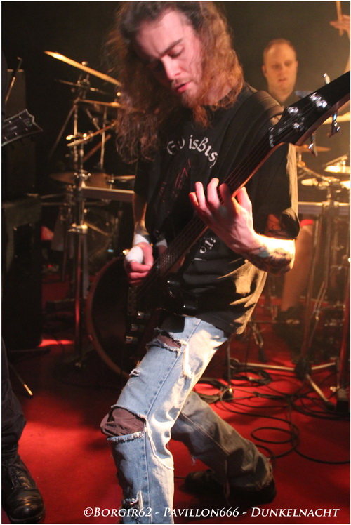 Et pourtant, il y avait franchement de quoi se déplacer jusque Roubaix. Trois groupes de black metal allemand et les locaux de Dunkelnacht étaient venus pour un concert qui aurait dû rester dans les mémoires. On peut dire que le pari est gagné puisque j'imagine que les groupes se souviendront de cette soirée, comme une région à rayer de la carte pour une prochaine tournée. Premier groupe à se présenter devant la vingtaine de paires d'yeux présente, DUNKELNACHT, bien connu des régionaux, le groupe répétant dans un local de l'HDLM. Ce concert était l'occasion de nous présenter leur nouveau chanteur, après le départ de Déhà quelques jours après le showcase qui s'était tenu sous ce même toit. Frost avait donc fort à faire quand on connait le talent de son prédécesseur et sa créativité (Ydharl, Deviant Messiah,...). Le concert commence et déjà, une énorme surprise: le son est très bon ! DN va donc pouvoir en profiter et se faire plaisir. Frost n'ayant eu que très peu de temps pour s'acclimater et apprendre les morceaux, je ne m'attendais pas à quelque chose d'exceptionnelle, et à un set réduit de moitié comparé aux 35 minutes habituelles (le groupe n'ayant qu' "Atheist Dezekration" à promouvoir). Mais finalement, on se retrouve avec un show d'une durée normale pour une première partie et les morceaux habituels sont joués, que ce soit "Etau Chrétien" ou "Oligarchislamisme" par exemple. L'ensemble tient la route et la trop mince assistance voit là un set bien géré. Même sur la forme Dunkelnacht réalise quelque chose de carré et le groupe semble vraiment se faire plaisir, avec un Frost qui viendra régulièrement agiter le public, Heimdall descendra de l'estrade et se joindra à son chanteur. Malphas impressionne concert après concert et sa timide (mais très bonne) prestation lors de son premier concert à Wavre est oubliée tant le dready est désormais à l'aise sur scène. Enfin, terminons-en avec Frost qui aura, pour une première, assuré au chant et m'aura même amusé avec son petit tatouage en forme de flocon (qui aura également fait rire Heimdall et Alkhemohr post-show).