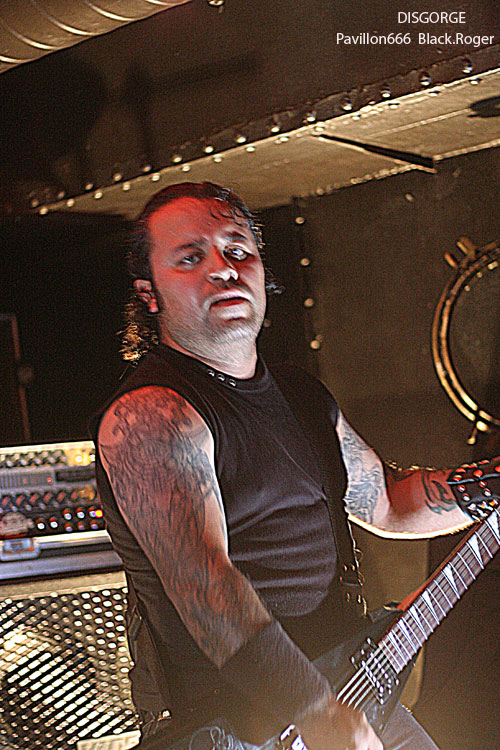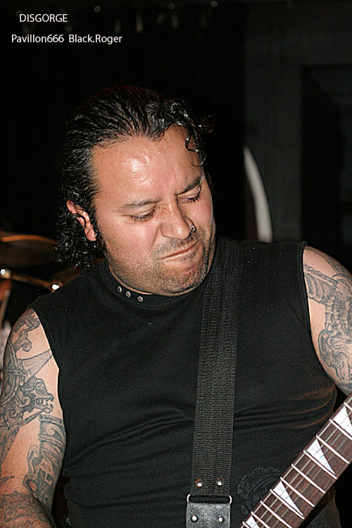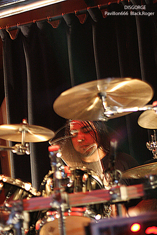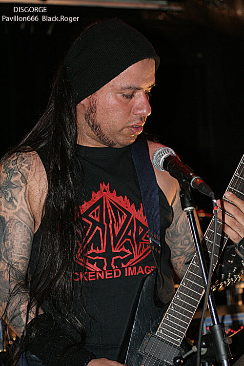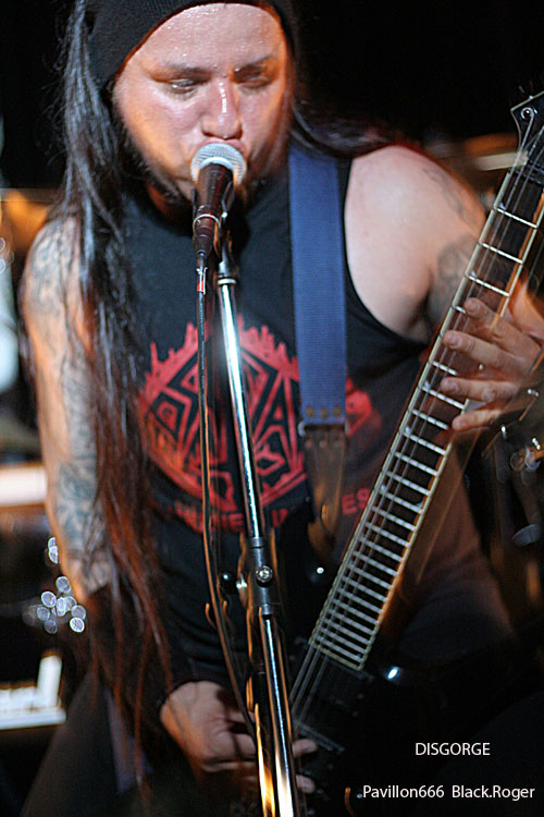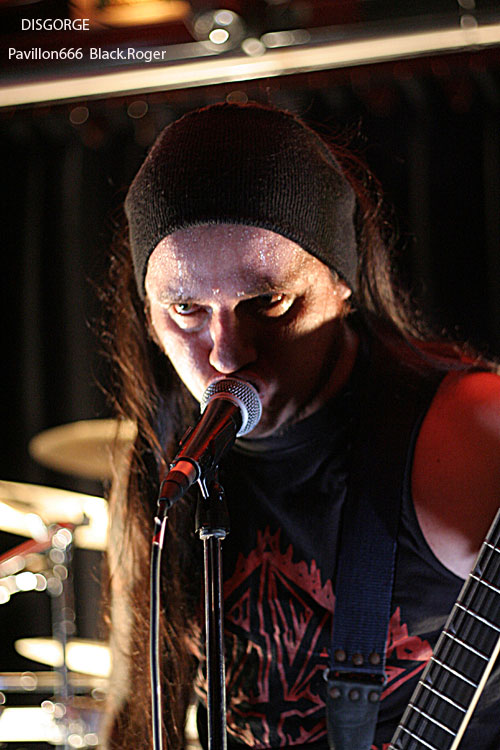 Passons maintenant à la tête d’affiche de la soirée, les fameux Mexicains ayant acquit une place “culte” dans le grind/death depuis longtemps déjà. Je veux parler bien sûr de DISGORGE. Alors, il va se passer quelque chose de vraiment troublant durant leur set. En effet, nous allons recevoir dans la tête un train lancé à grande vitesse avec la violence technique et morbide du quatuor. DISGORGE, c’est vraiment le style « char d’assaut » avec blasts incessants, riffs meurtriers et malsains, ambiance mortuaire, gore, à l’extrême de l’extrême, bref je ne vous fait pas un dessin. Et le public dans tout cela reste statique, blanc comme un cierge de pâques, comme pétrifié par tant de débauche musicale, comme incapable de remuer tellement son esprit semble saturé de « vomis » malsains, de hurlements « guitaristiques » et de basse vrombissante accouplée à une batterie en folie ». Et puis, c’est un comble, progressivement la péniche se vide inéxorablement, il ne reste plus qu’une cinquantaine de personnes figées, comme assommées par le déluge sonore, pourtant c’est DISGORGE que diable, avez-vous peur ? Mais les irréductibles en veulent encore, incompréhensible, alors nos amis Mexicains reviennent par deux fois en rajouter une couche bien pimentée. Prestation mortelle qui tue la mort, DISGORGE n’a pas faibli ce soir et fut excellent, nous donnant rendez-vous au prochain Hellfest naturellement, quant au public…