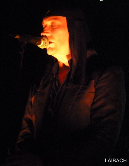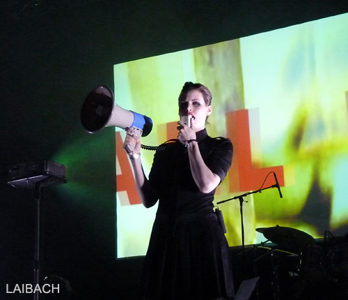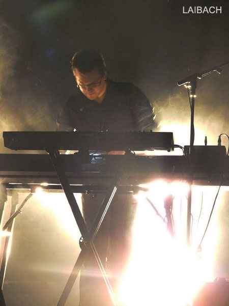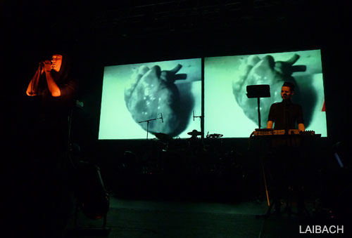 L'ambiance est décontractée, mais va sensiblement se modifier avec l'accès à la scène et l'arrivée de LAIBACH. Les slovènes ont effectivement prévu un set bien construit, en progression, avec une entame axée sur leurs titres les plus froids. Avec un véritable batteur mais sans guitares, le groupe et ses machinistes programmateur pose le décor de la musique industrielle dans toute sa splendeur. Rythmes martiaux, sonorités froides, expérimentales, présences scéniques effacées, appui visuel avec projections d'images de propagande sur deux écrans, Laibach crée une sorte de distance, un univers glacé difficilement pénétrable. Le chant grave, sombre et dénué de chaleur confirme les 20 premières minutes dans cette voie, à la fois un peu dérangeantes et captivantes.