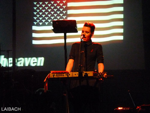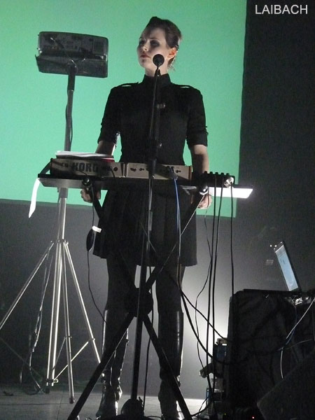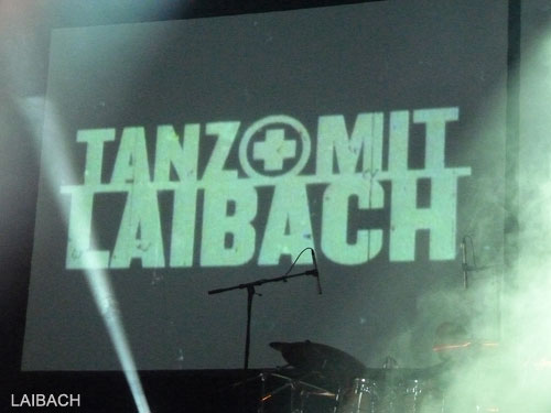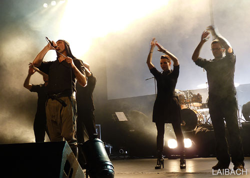 Peu à peu, les éléments de percussions se font plus fluides, plus incisifs, il est temps d'entamer la séquence "Tanz mit Laibach" avec un changement de programmes vers les heures plus "electros". Les beat sont puissants, répétitifs et martèlent une assemblée bien consciente de la performance qui lui est offerte ce soir. Les musiciens sont alors plus animés bien que la communication avec le public soit limitée à des regards ou quelques gestes. Pas de sourires, pas de discours, Laibach sur scène, c'est avant tout un show en acier trempé : indestructible, net, ultra précis. Car le groupe avance, sans faille, enchainant des titres forts aussi bien d'un niveau visuel (remerciement particulier à l'éclairage) qu'auditif (le volume étant effectivement poussé à haut niveau). Devenu maître de cérémonie, le chanteur se libère et donne plus d'ampleur à son timbre de voix si particulier tout en soulignant des associations avec un chant féminin très réussies.