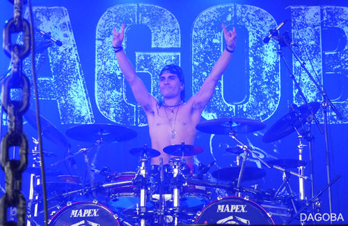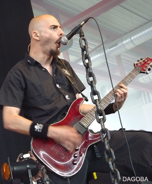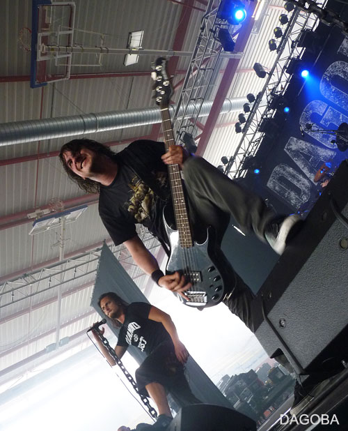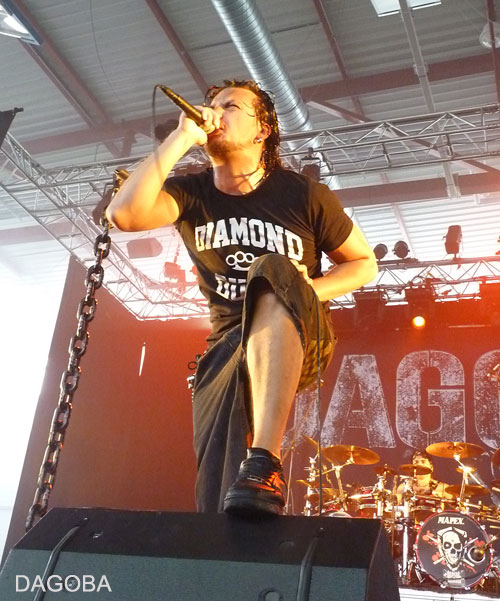 Mais pour l'instant nous sommes encore en 2011, et le moment est venu de découvrir la scène principale recevant Dagoba. Premier constat : les fenêtres de ce gymnase réaménagé ne sont pas masquées, tous les groupes devront donc jouer comme en plein jour, avec pour effet d'atténuer considérablement les jeux de lumières. Pour Dagoba, aucuns problèmes, sur terre, sur mer, sous la pluie ou en pleine chaleur, le résultat est toujours des plus explosif. Le premier titre met tout le monde d'accord : il va y avoir du sport. Effectivement, pas besoin pour le frontman d'appeler le public à bouger, pogo, braveheart et circle pit auront tôt fait de réchauffer les lieux. Plus le temps passe et plus le groupe semble maitriser l'exercice du live avec des prestations toujours plus tonitruantes. Arrosés de sueurs, les premiers rangs prennent leur douche sous les cheveux (pardon Izakar) de musiciens déchainés. Le petit accent du sud fait du bien à entendre sous ces latitudes du nord, car en plus d'être une bêtes de scène, Dagoba est en plus un groupe qui communique beaucoup et qui se rend toujours très accessible auprès du public, comme en témoigne la présence des membres dans les couloirs avant et après le show.