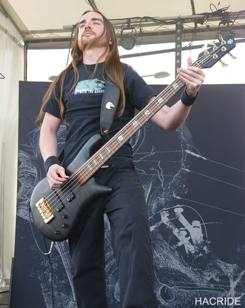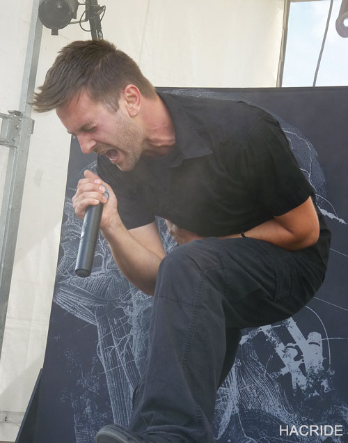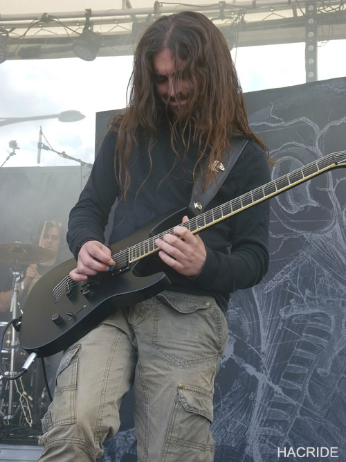 Retour vers la scène extérieure où Hacride a déjà installé son décor. Avec des album pures pépites sonores en guise de carte de visite, le groupe s'impose indubitablement comme une des valeurs sûres du metal français. Un problème demeure cependant : les poitevins parviendront-ils à faire entrer les spectateurs dans leur univers si particulier? Impossible de savoir en tous cas avant d'essayer. Le quatuor s'élance donc dans un set intense de death/progressif, structurant le déstructuré, faisant résonner le dissonant. Pesantes et denses les compositions divisent toutefois : certains parviennent à pénétrer la complexité pour tomber dans un état quasi hypnotique, mais d'autres se retrouvent au pied de portes hermétiquement closes. La qualité musicale et la maitrise du sujet sont évidentes, mais les sensations du live diffèrent selon les individus et peut-être que beaucoup parviendraient plus à s'immerger dans ce monde torturé via une écoute approfondie sur CD que devant une scène.