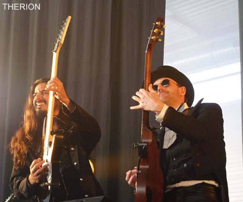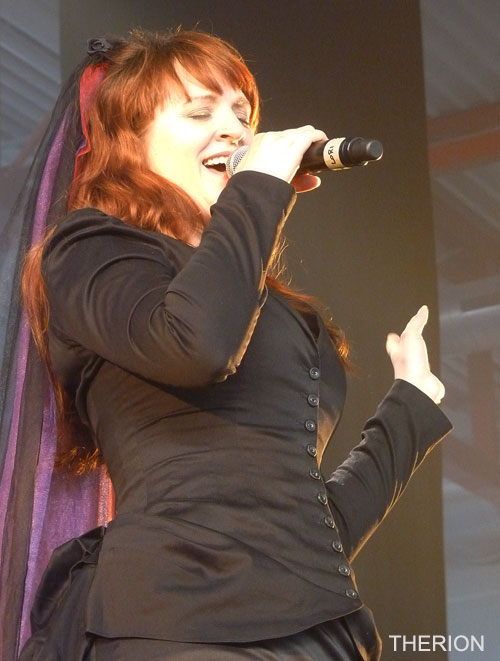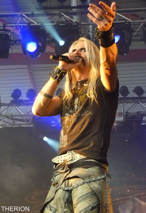 Direction l'univers fantastique de Therion pour la suite du programme. Malgré un passage à Lille en Novembre dernier, le prestigieux groupe suédois attire toujours les foules, comme en témoigne la forte affluence du moment. Petit hic : à 20h il fait encore beau temps et la luminosité qui pénètre dans la salle ne met malheureusement que trop en valeur le coté un peu kitch des costumes des musiciens. Dommage pour Therion chez qui la mise en scène tient une place prépondérante et qui pour le coup prend le risque de voir son visuel verser vers la mauvaise comédie musicale. Heureusement, le groupe, qui bénéficie d'un temps de set réduit par rapport à ses prestations habituelles, choisi des titres les plus connus de sa discographie (bien que l'absence de "Sitra Ahra" parait étonnante). Néanmoins, les multiples mimiques des chanteurs indiquent que quelques chose ne semble pas tourner rond, sans doute un problème de retour? Toujours est-il que la puissance caractérisant les prestations habituelles n'est pas tout à fait au rendez-vous. Les fans approuvent malgré tout les titres qui se succèdent en cascade mais il faut le reconnaitre, Therion ce soir n'est pas au sommet de sa forme. La remplaçante de Katarina Lilja fait de son mieux mais sa faiblesse vocale contraint Lori Lewis à assurer la majeure partie des chants (non sans certains gestes d'humeur). La belle s'en tire certes avec maestria mais au final, s'il est toujours plaisant d'entendre les classiques du groupe, il manque un petit soupçon d'engagement pour aboutir à un show vraiment convaincant. Pendre le couturier responsable des pantalons et revenir avec un line-up de live stable ne peuvent être que deux souhaits à formuler à Therion, groupe prestigieux qu'il est toujours bon de revoir sur scène.