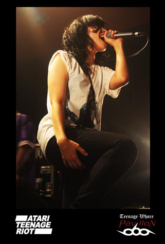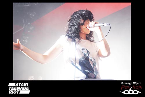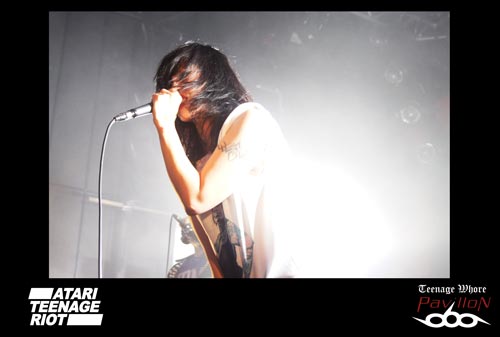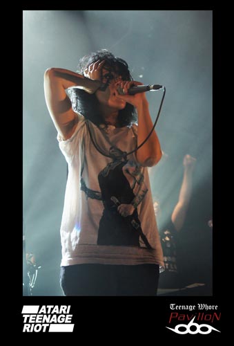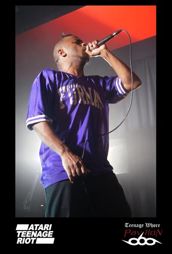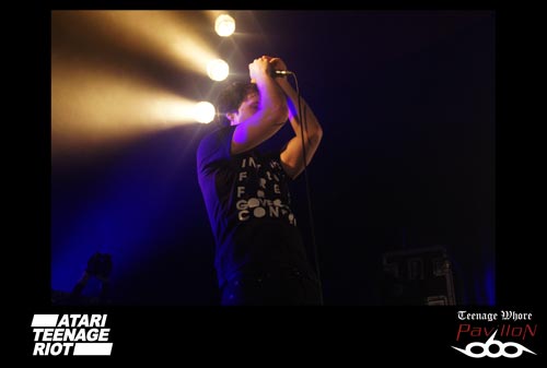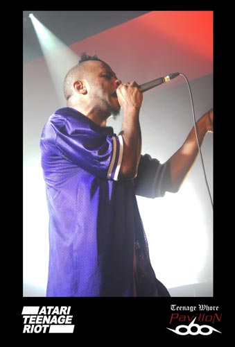 Enfin, le moment est venu d’accueillir ATARI TEENAGE RIOT. On sent un public impatient et prêt à sauter de partout ! La musique commence et nous nous attendons à voir débarquer les 3 phénomènes d’un moment à l’autre. Ce fut un peu plus long, l’intro durera pratiquement trois morceaux ! Sur le côté, nous pouvons voir de loin, le groupe en train de se concentrer, afin de débarquer d’un moment à l’autre sur scène. Alec Empire se prend pour Rocky en boxant avec sa propre ombre … sympa l’échauffement ! Après cette longue attente, qui a permit de chauffer quelque peu la salle, ces trois personnalités débarquent sur scène. Et c’est partie pour un peu plus d’une heure de rythmes psychédéliques, furieusement électro, de quoi satisfaire tous les fans. Le tempo est dure à tenir, surtout quand notre taux d’alcoolémie est à la normal et que nous n’avons aucune substance illicite dans le sang ! Les lights blanches, ne s’arrêtant très rarement, frappent la scène tous les demi-secondes, de quoi avoir une bonne crise d’épilepsie ou de devenir aveugle, au choix !! Mais bon, l’ambiance musicale que dégage ATARI TEENAGE RIOT se prête bien au jeu. Le groupe a envie de dépasser ses limites ce soir, et de faire en sorte que le public dépasse les siennes également. Celui-ci est en transe, surtout quand Alec Empire s’approche du public pour des « Give Me Five ! » à foison. De quoi exciter encore plus ses fans qui visiblement, prennent ce genre de concert pour un défouloir public. Musicalement, le combo jouera des inévitables titres de leur répertoire comme « Speed », « Atari Teenage Riot », « Shadow Identity », ou même « Into The Death ». Après deux rappels, le groupe quitte la scène sous des acclamations.