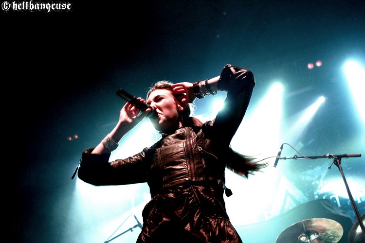 La démesure se présente quant à elle avec Amaranthe et ses trois chanteurs, là encore réunion de membres d'autres groupes bien connus (Engel, Panzerchrist, Kamelot, Nightrage), mais qui ne bénéficie pas de la même humulité et sincérité que leurs prédessesseur. Non pas que les personnalités qui composent ce groupe soient désagréables (elles seront au contraire très disponibles après le show), mais l'espèce de buzz médiatique qui entoure le premier album du groupe fait passer AMARANTHE pour un pur produit commercial surfait et lissé au possible. La prestation le sera tout autant, avec comme premier indice révélateur le manque de cohérance récurrent dans le passage de micro entre les trois chanteurs et la visible hierarchie qui règne entre-eux : Elize surnage largement au dessus de ses deux collègues. La vue de la ravissante chanteuse et de son déhanché devastateur sont agréables, mais un petit quelque chose manque dans sa présence et son charisme, probablement une touche un peu plus métallique qui nous ferait oublier cette impression de se trouver face à une performeuse de musique pop. Le Death mélodico-industrialo-symphonique du sextet est néanmoins mis en valeur par un véritable sens du rythme, des samples efficaces et une bonne communication avec le public, dont une large partie semble apprécier la prestation. L'interprétation du fameux single "Hunger", remportera la majorité des suffrages ; on ne peut pas dire qu'AMARANTHE soit un groupe insupportable, mais la promotion et le lissage qui l'entoure restent largement discutables.