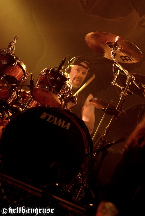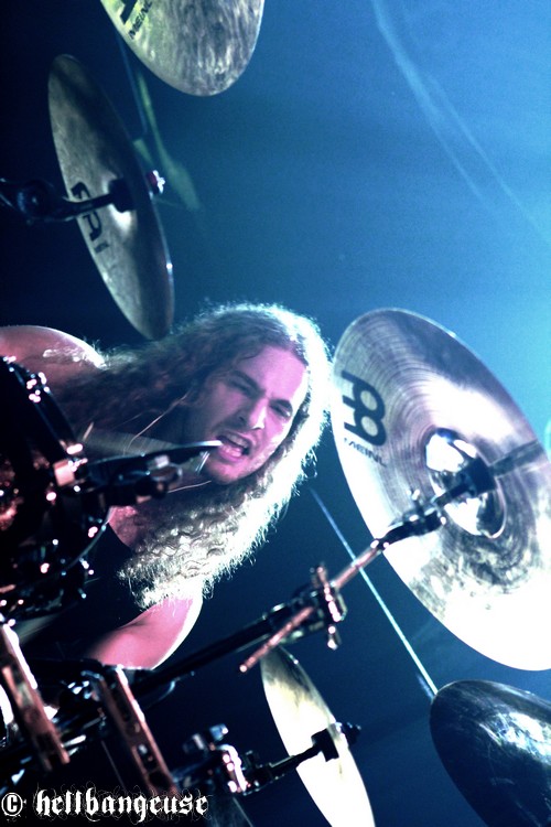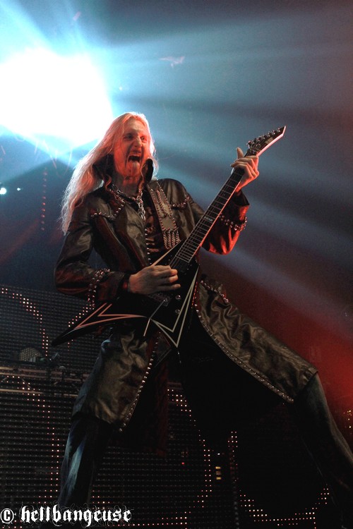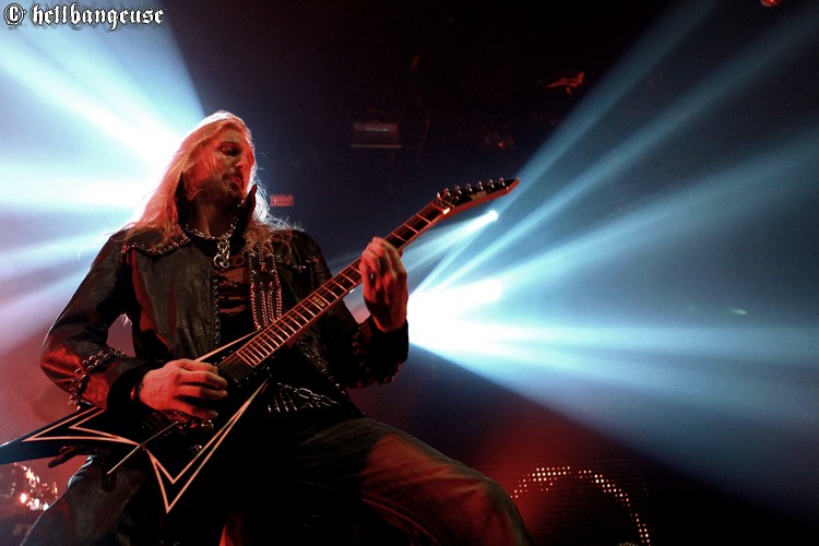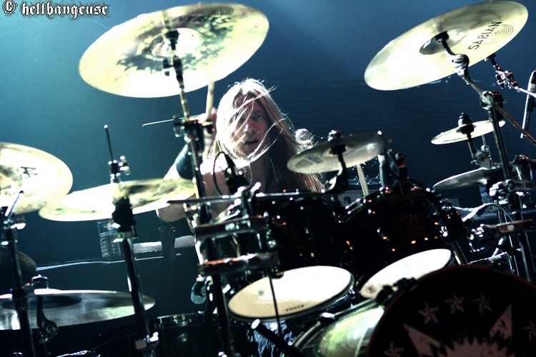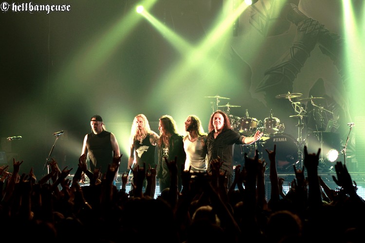 "Et maintenant, voici venu les Barbapapa"... Non, pardon, juste HAMMERFALL. Et c'est déjà tout un spectacle en soi, rien qu'à voir le plateau imposant qui se dresse maintenant sur scène, avec pour point dominant la batterie surmontant une large estrade dotée de néons lumineux. Un véritable programme pour ce soir, qu'une arrivée triomphale des cinq gaillards sur scène ne fait que confirmer. On remarque immédiatement la qualité sonore de chaque instrument, calibré comme il se doit, sonnant distinctement tout en laissant place à la frappe structuratrice et régulière d'Anders Johansson, comme l'exige le style. La cohésion humaine et scénique des musiciens saute aux yeux, on sent comme une osmose qui règne sur scène et qui permet à chacun de donner le meilleur de soi-même tout en servant la musique du groupe. L'ambiance qui règne dans la salle, sans pour autant être tout à fait extatique, se révèle suffisamment chaude pour entendre les cris de certains fans qui profitent autant qu'ils le peuvent d'une prestation (il faut bien l'admettre) monstrueuse. Bien conscient du pouvoir qui repose entre leur mains, HAMMERFALL a décidé de dresser une set-list regroupant la plupart des meilleurs titres que le groupe compte à son actif, tout en déclarant avec humour que quand on est dans un groupe aussi important qu'Hammerfall, on a tout le temps chez soi de voir quels sont les titres qui ont été le plus téléchargé par les fans (légalement bien sûr) et d'en faire une set list pour la tournée suivante. Nous voilà prévenu, et c'est sans grand ménagement que les brillants "Steel Meets Steel", "Legacy of King", "Last Man Standing", "Let the Hammer Fall", et bien d'autres encore nous sont assénés avec charisme et entrain par la bande de Joacim. Seule la balade "Glory to the Brave" ne semble ici pas à sa place, bien que certains sauront apprécier ce moment de répit avant le grand final "One More Time"/"Hearts on Fire", qui finit d'achever tout le monde au bout d'une bonne heure et demie d'un set affreusement efficace, qui aura écrasé tout sur son passage.