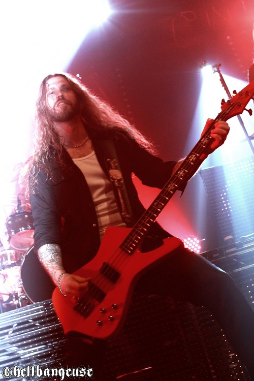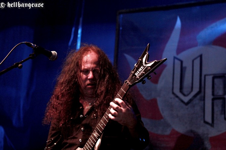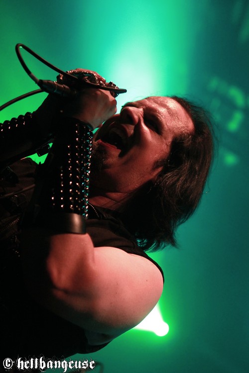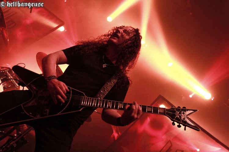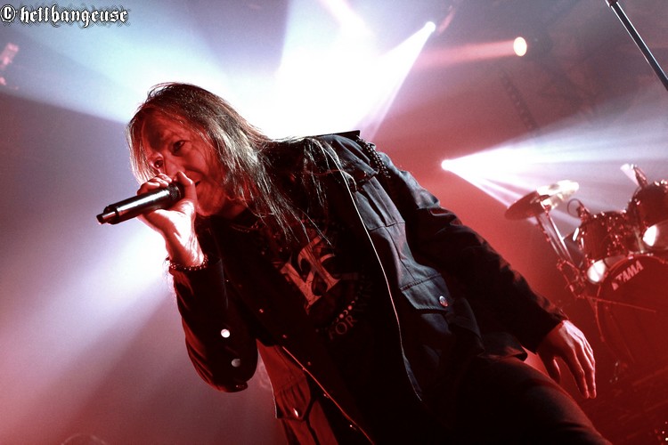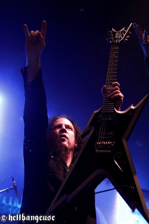 La soirée prend un tournant plus sérieux et cohérent musicalement avec l'arrivée des américains de VICIOUS RUMORS sur scène, groupe mythique de Heavy Metal en puissance. Seul véritable maître à bord depuis les années 80, Geoff Thorpe (guitare) a vu nombre de musiciens défiler au sein du groupe, et pas moins de cinq chanteurs différents pour les cinq précédents albums. Difficile alors de penser que Brian Allen pourrait mener avec charisme le groupe le temps de la prestation, pourtant celui-ci se révèle être un chanteur hors pair, qui maîtrise les exigeances musicales du genre avec une rare finesse et un plaisir évident. La dynamique et le style restes certes résolument kitsch, ringard diront certains, mais n'est-ce pas justement ce qui fait la force d'un bon groupe de heavy qui assume sa musique corps et âme ? Plus que défendre son dernier album en date ("Razorback Killers", globalement bien accueilli par les médias européens), VICIOUS RUMORS vise ce soir à offrir un éventail avantageux de sa discographie pour satisfaire un maximum de personnes et brosser un tableau presque complet de ce que le groupe à pu offrir au Heavy Metal depuis ces vingt dernières années. Geoff et sa troupe prennent ainsi un malin plaisir à remonter jusqu'en 1988 avec le LP "Digital Dictator" (quel sens de l'intuition soit dit en passant) pour nous asséner une musique brute et sincère, qui parvient rapidement à électriser le Bataclan, preuve que le choix d'un tel groupe pour acccompagner HAMMERFALL ne s'est pas fait au hasard et avec un bon goût qu'il convient de souligner.