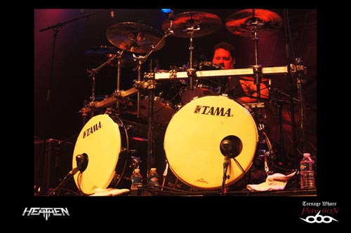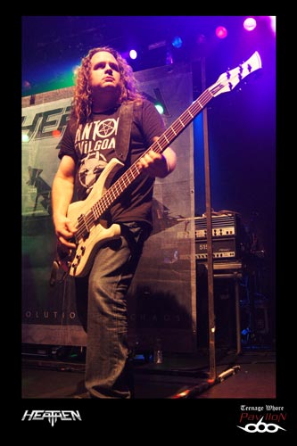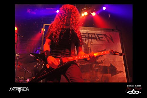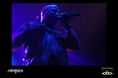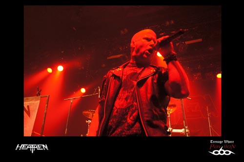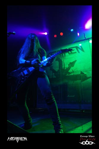 Puis, c’est au tour d’HEATHEN de rentrer sur scène. Le groupe nous fait partager son Thrash aux intonations Heavy à la voix. Les zicos se donnent à fond ce soir. La setlist est là aussi très courte, mais nous avons tout de même la chance de bouger sur « Pray For Death » et « Death By Hanging ». Quelques problèmes techniques interviennent : Le chanteur croit de vouloir chanter dans le micro de son guitariste, mais visiblement il n’y a presque pas de son, puis le passage du son clair du grateux lors d’un solo … mais il en faudrait plus pour déstabiliser HEATHEN là aussi. Les Américains ne se défilent pas et nous offrent un très bon show.