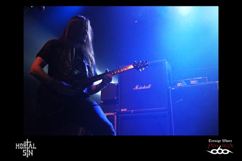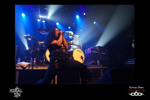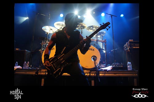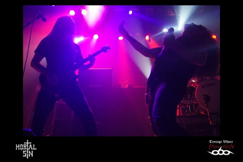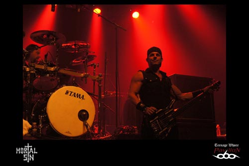 14h : La foule commence à débarquer devant le Bataclan. Les premiers chevelus font leurs apparitions. A l’intérieur, ça se bouscule. Préparer un show pareil demande une organisation de précision. Les groupes, eux, sont à l’heure de la détente. Mike Sifringer (DESTRUCTION) se promène tranquillement, tandis que Jason Viebrooks (HEATHEN) regarde attentivement les roadies faire leurs job, et enfin Tom Hunting (EXODUS) qui demande aux fans dehors ou est-ce qu’il pourrait trouver de la lingerie fine pour sa femme à Paris !!!. La seule chose qui peut étonner au plus haut point, c’est que ce Thrash Fest n’affiche pas complet. Mais ou sont passées les Thrashers ? Une affiche pareille aurait du être sold out après deux semaines d’affichages. Le public en France bouderait-il les classiques ? Le Old School deviendrait-il « has been » ? 16h30 sonne et c’est à MORTAL SIN d’ouvrir le show. Malheureusement, on se rend vite compte qu’un membre du groupe manque à l’appel … le chanteur ! Pour le premier morceau, ce sera donc au bassiste de le remplacer. Peu importe, MORTAL SIN garde la pêche et le membre manquant ne tarde pas à faire son apparition en expliquant au public qu’il était coincé dans le métro parisien ! Ah, les joies de la vie parisienne !!! Malgré ce soucis technique qui aurait pu en déstabiliser plus d’un, le groupe nous offre un très bon Thrash Old School. La setlist est courte mais suffisante pour chauffer le public.