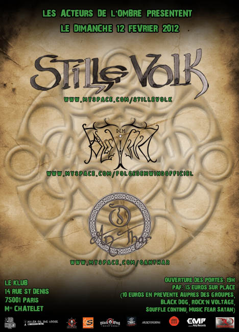 La scène pagan parisienne se pressait en nombre en ce dimanche soir malgré les frimas hivernaux. Et c’est devant un Klub qui affiche complet que je me retrouve pour ce concert des folkeux toulousains de Stille Volk, le premier à Paris depuis un show en 2010 au Cernunnos Pagan Fest à l’Elysée Montmartre, me-semble-t-il. C’est d’ailleurs déja la même association en l’occurrence les Acteurs de l’Ombre qui avaient été à l’origine de leur venue, de même qu’en 2007 pour un autre Cernunnos… On est d’ailleurs en présence de nombreuses têtes connues si l’on suit la scène, notamment des musiciens d’autre formations tels Nydvind. Pas de Cernunnos en ce début d’année, pas de Paganfest non plus qui évitera Paris malgré le line-up le plus intéressant depuis des années (Primordial, Negura Bunget, Solstafir, voila qui aurait changé des éternels Korpiklaani, Ensiferum et consorts…), peut-être sont-ce des éléments à prendre en compte et qui pourraient expliquer le succès de ce concert et les quelques personnes qui se seront malheureusement vues refusées l’entrée… Sans doute également les premières parties issues de la région et qui auront fort logiquement ramené des supporters. La petite taille du Klub a évidemment son importance mais on en arrive toujours à l’inévitable problématique pour l’organisateur de concert (ou de tout évènement festif) à savoir estimer l’audience en avance et évaluer le risque de prendre une salle de contenance intermédiaire en pariant sur le succès du concert ou assurer le coup en prenant plus petit… En tout cas l’affiche est clairement éclectique bien dans l’esprit entretenue par l’association, avec trois groupes évoluant dans des registres très différents, certes toujours dans des styles associés au pagan mais assez éloignés musicalement parlant.