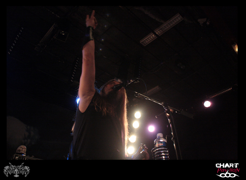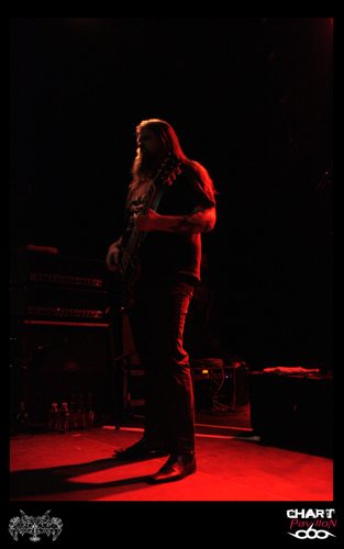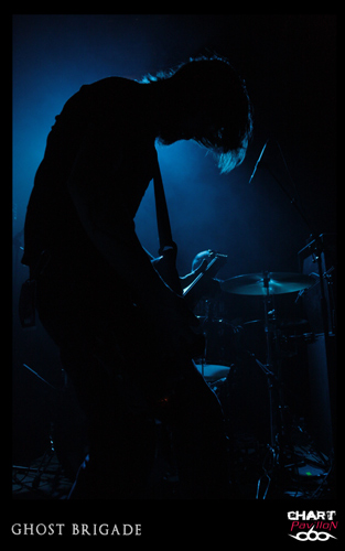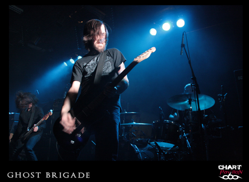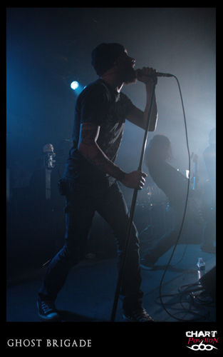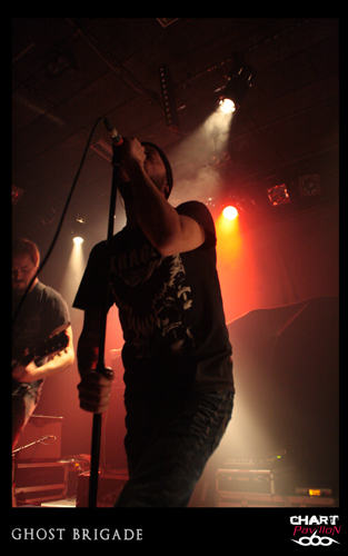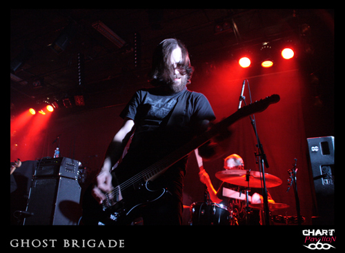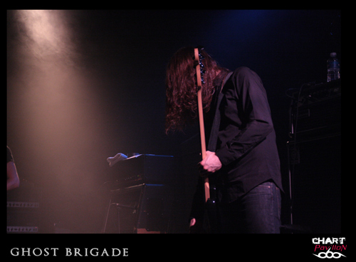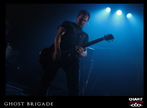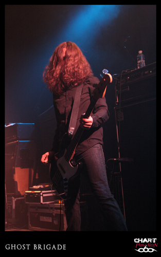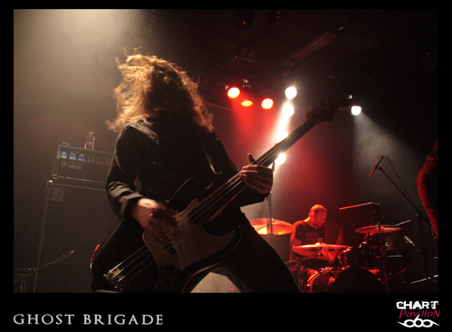 Il est maintenant temps de retrouver cette seconde formation dont le style pourrait lui aussi être qualifié de post metal. GHOST BRIGADE a pris la route avec ENSLAVED afin de défendre son petit dernier opus « Until Fear No Longer Define Us » sorti en 2011. Le style avait d’ailleurs évolué pour s’adoucir par rapport à « Iolation Songs » paru deux ans auparavant. Le choix des morceaux a évolué avec le style. Cela donne, avec la prestation de LODZ, une première partie de concert lourde à souhait. Le public est d’ailleurs arrivé en masse pour le show de GHOST BRIGADE. La salle commence a bien se remplir. Il faut dire qu’il serait regrettable de manquer ce style de groupe. Certes, il y a eu comme un effet de mode assez récemment avec ce retour à la lourdeur dans le metal marqué par la percée de formations telles que CULT OF LUNA et la montée en puissance de NEUROSIS. Même si on a la légère impression que tout cela fait partie d’une sorte d’effet de mode, on est tout de même bluffé par la puissance que ces groupes dégagent en live. Le défaut, c’est que peut-être toutes ces formations commencent à légèrement perdre de leur identité. Même avec une prestation remarquable, on commence à avoir comme une impression de déjà-vu. Ce serait vraiment dommage de se gâcher le plaisir d’assister à un show de cette qualité en se disant que oui, c’est bon mais en même temps, ça comme à rappeler un peu trop d’autres choses. On notera tout de mêmes d’excellents titres joués ce soir tels que « Lost In A Loop », « Traces Of Liberty » ou encore « Clawmaster ».