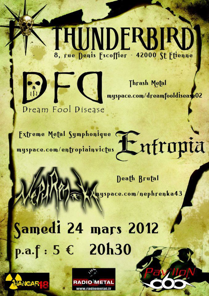 Le groupe DREAM FOOL DISEASE nous donnait rendez-vous ce samedi 24 Mars dans l’antre de James, le Thunderbird Lounge, café-concert rock incontournable de l’underground Stéphanois. Arrivé vers vingt heures dans la petite rue Denis Excoffier, il ya déjà du monde devant et dedans l’établissement à l’accueil chaleureux. Mais il faudra attendre 21 heures dans les sofas du bar pour que débute au sous-sol le concert métal de ce 24 mars. Au menu, du black, du death, du thrash, délivré par trois formations régionales. Alors, vous êtes prêts ?