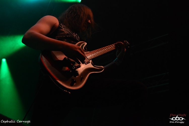 Et autant dire qu'on commence fort avec CEPHALIC CARNAGE en ouverture de journée. Salle pas tout à fait comble, mais qui aura l'honneur de le finir pratiquement, les Américains et leur "Hydrogrind" met en appétit ! En parlant d'appétit d'ailleurs, quand on ne croisait pas Leinzig (chant) la veille qui cherchait après quelque chose à fumer, celui-ci en arrivant sur scène nous tend un plateau de catering dans le pit photo (que bien sûr on fera tourner au premier rang après s'être servi) avec tout pour se faire un bon lunch, excepté la bière et la-dîte substance qui se fume ! Fumeurs oblige, ceux-ci ne cessent de scander "Need more weed ! " tout au long du concert, dur dur pour les non-Hollandais quand on sait que pour nous autres étrangers, l'entrée dans les coffee shop nous est refusée... Bon sinon niveau musique, ça envoie toujours autant que la première fois (ah ce concert à Boulogne sur mer en 2005... presque 10 ans n'empêche !), un jeu de basse effarant, des riffs dans tous les sens, on reconnaît bien là le "Technico grind/death" du Colorado, en plus d'un énorme son qui les honore, quand c'est pas trop bordélique... Côté setlist, vu que ceux-ci n'ont rien sorti de nouveau depuis 2010, c'est avec joie que j'y retrouve les habituels "Divination & Volition", "Endless Cycle of Violence" et le trio final "Kill for Weed"/"Lucid Interval" et "Black Metal Sabbath" qui leur fera toujours honneur, car pour le coup, entre le masque tête de cheval, ou celui de l'oeil pour le batteur (il est magique ce masque !) c'est une bonne tranche de rigolade !