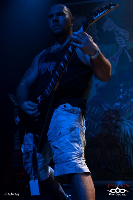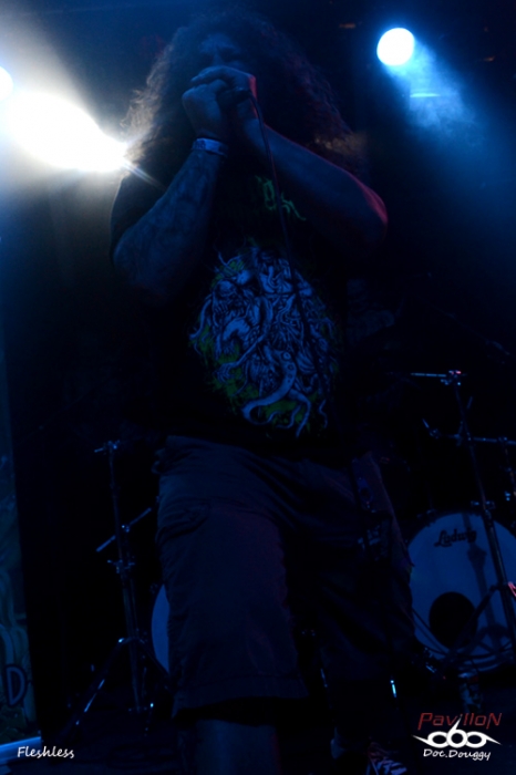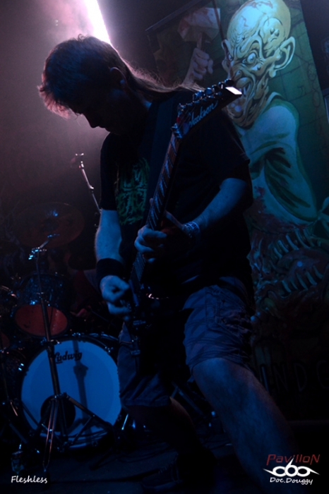 Sur la Second ce sont les Tchèques de FLESHLESS qui enchaînent. Après m'avoir tapé dans les esgourdes à l'OEF et au Deathfeast l'an dernier, je m'attend à remettre ça cet après-midi. Et même si sur album, par moments le manque de basse se fait sentir, ce n'est plus le cas en condition "live". Le Death metal que délivre le quatuor m'étonne toujours autant car y reprenant subtilement tout ce qui en fait sa diversité. Entre passages "slamming" sont ajoutés des parties mélodiques bien réussies, le tout porté par une session rythmique oscillant parties "speed" ou plus brutales. De quoi s'adonner assez facilement au headbanging. Et même si le groupe ne fait pas salle comble, ceux-ci s'en donnent à coeur joie devant une prestation juste et carrée. A voir et revoir.
