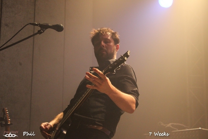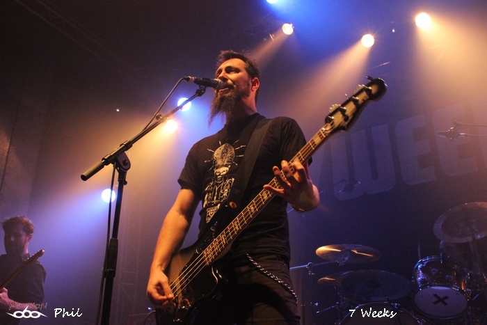 7 WEEKS s'engage dans une nouvelle tournée afin de présenter son nouvel EP, "Bends" et Nicolas son nouveau guitariste, et a choisi de débuter son périple par Savigny le Temple. Les quatre musiciens n'en sont plus à leur coup d'essai et sont d'entrée de jeu directement dans l'ambiance, Julien fait vibrer ses cordes vocales et vrombrir sa basse. Le frontman est heureux de s'exprimer et de faire honneur aux nouvelles compositions du groupe, cela se ressent dans la fosse. Manu est déchainé et ne reste pas en place, il danse et se désarticule devant ses machines et claviers. Nicolas montre qu'il est autant à son aise sur l'ensemble du répertoire du groupe, dévisse des riffs pêchus et sort quelques soli captivant. Jérémy n'est pas en reste, tout sourire comme ses compères, il semble heureux de mal mener ses fûts et surtout d'assurer le groove avec Julien quelque soit l'atmosphère engagée.