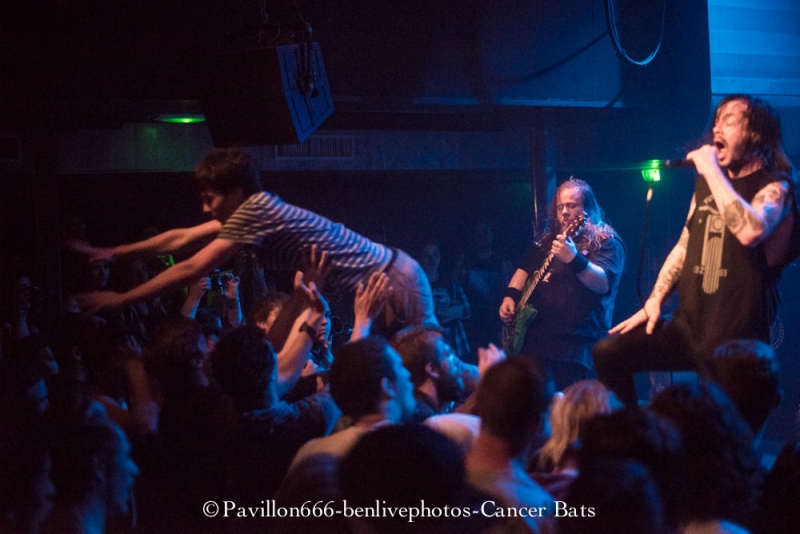 Les spectateurs ont une vingtaine de minutes pour se reposer. Parallèlement, la salle se remplit nettement. Même si Cancer Bats n’est pas tête d’affiche ce soir, il n’en reste pas moins que les Canadiens sont internationalement reconnus. L’audience vient aussi pour les voir. Cancer Bats est composé de 4 lascars bien remontés sur scène. A commencer par leur chanteur charismatique Liam Cormier, Scott Middleton à -l’unique- gratte, Mike Peters à la batterie et pour finir Jaye R. Schwazer à la basse ainsi qu’aux backgrounds vocals. Leur tournée a pour but de promouvoir leur nouvel album “Searching for Zero” sorti en mars. Dès les premiers accords, c’est l’effervescense. Leur metal punk embrase la foule qui gesticule dans tous les sens. Leur son reste assez original avec un mélange de metal et de punk mais aussi des influences assez sludge/stoner, notamment pour la guitare. Scott Middleton, le gratteux semble être accordé assez bas, le son est assez gras et crunchy. Il utilise aussi beaucoup d’harmonies naturelles et artificielles, ce qui donne une vraie bonne touche et permet de bien distinguer sa gratte. Au chant, Liam est plein de fougue. Ses cris sont juste plein de rage et de hargne. Il est aussi secondé par Jay, le bassiste, qui lui aussi ne se retient en rien et hurle de toutes ses tripes. Liam n’hésite pas non plus à s’adresser aux spectateurs en français pour raconter diverses anecdotes qui nous font sourire. La batterie est surélevée, mais tellement garnie que l’on a du mal a voir le batteur, du moins de mon point de vue. Par contre on l’entend parfaitement se déchainer dessus comme un forcené pour assurer ses rythmes qui ne semblent jamais ralentir. Cancer Bats nous fait une reprise de “Sabotage”, titre mythique d’un groupe mythique : Beastie Boys. Ce morceau a tout simplement envoyé le public dans une autre dimension ! Stagedive, headbanging, toute forme d’expression a été passée en revue !