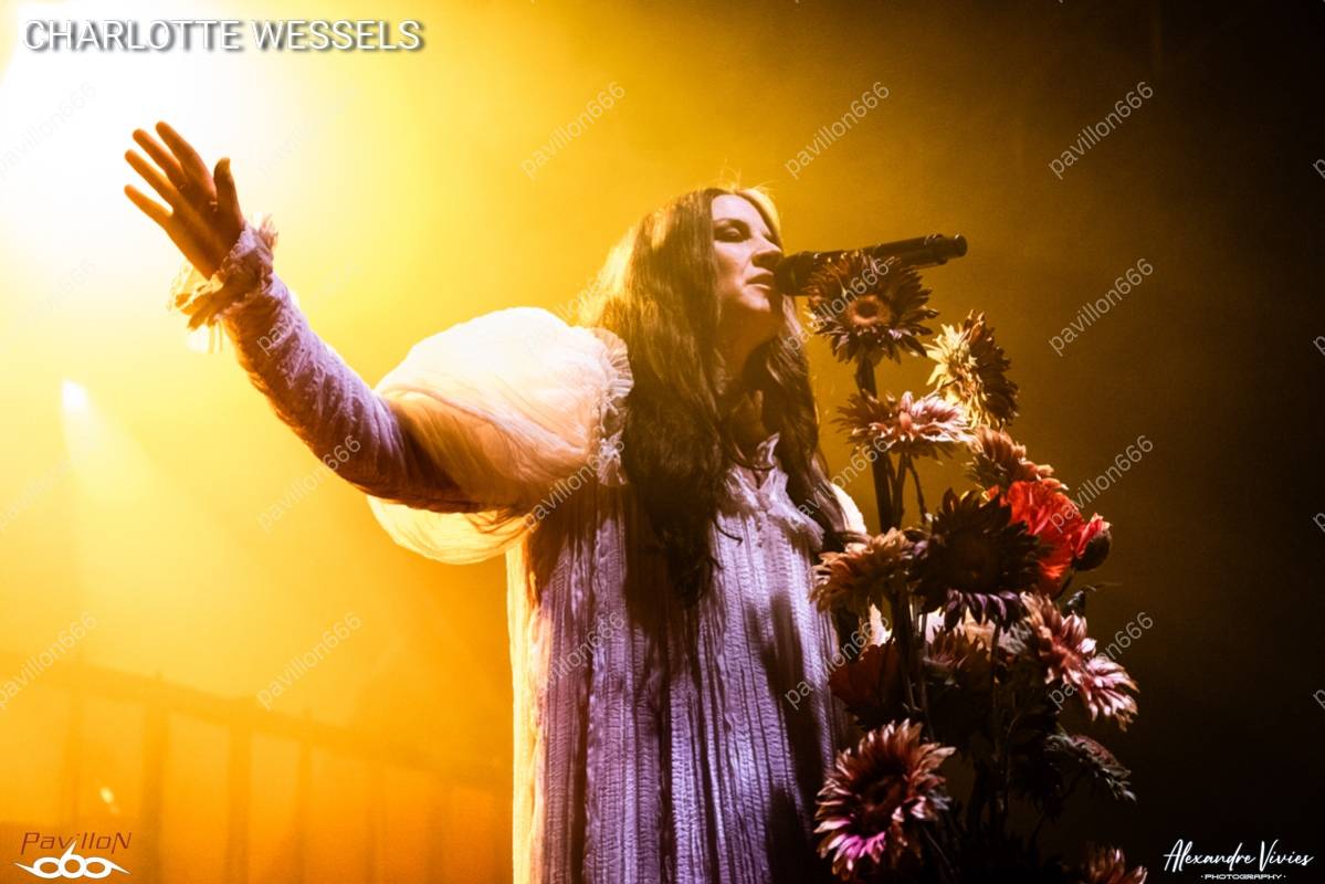 La salle est déjà bien remplie pour accueillir Charlotte Wessels et ses musiciens, tous d’anciens membres de Delain (à l’exception de la claviériste Nina van Beelen). Dès les premières lignes de « Chasing Sunsets », la chanteuse nous embarque, tout en douceur, dans son univers onirique. Dans sa longue robe blanche et derrière un pied de micro fleuri de tournesols et de coquelicots, elle capte naturellement l’attention de l’auditoire, que sa voix enchanteresse s’attache à maintenir entière. La part belle est naturellement faite au dernier opus et les chansons sont efficaces. Certains pourront regretter l’absence de Simone Simons sur « Dopamine », chantée en duo sur le CD, qui n’est pourtant pas très loin ; cela aurait été une jolie surprise, mais qu’importe. La prestation fait son effet et l’on perçoit aisément, tout au long du set, l’alchimie cultivée par les musiciens au cours de leurs années Delain.