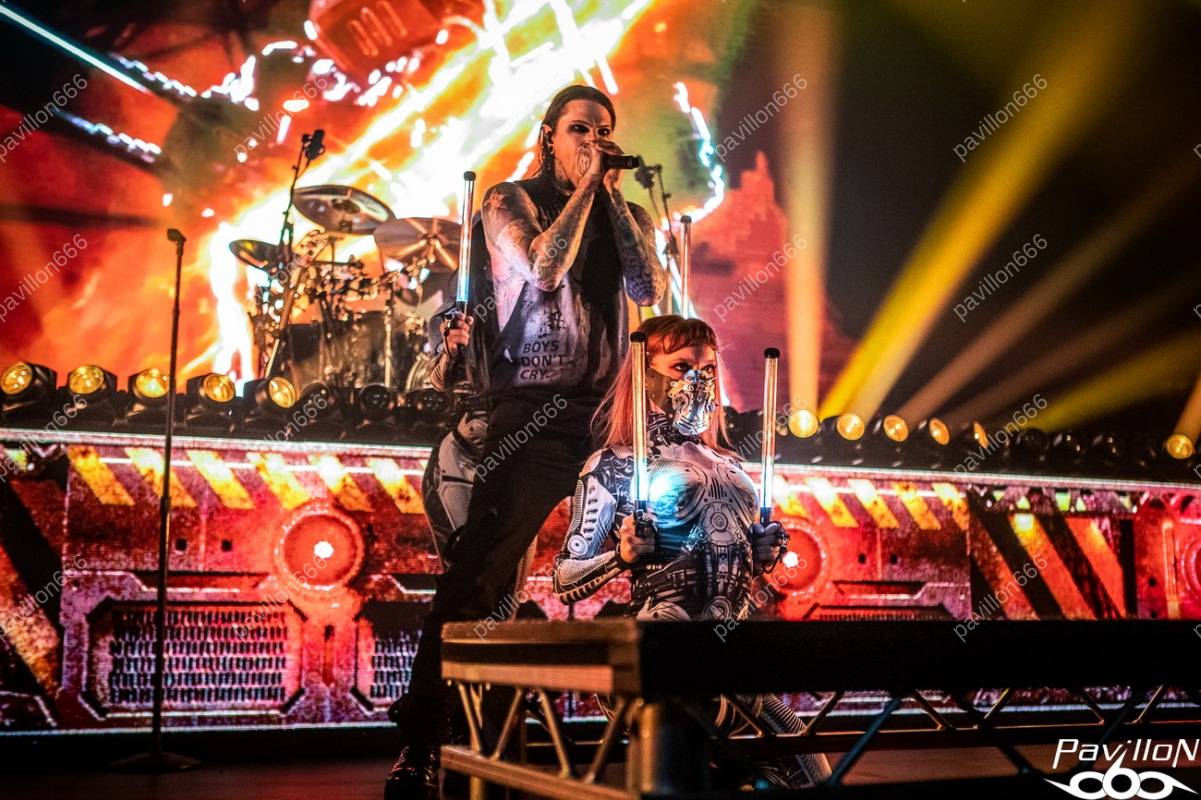 Il faut dire que les Américains ont sorti l’artillerie lourde. La production est impressionnante : écrans géants, projections vidéo, pyrotechnie et canons à confettis viennent habiller un show pensé pour les grandes salles. À cela s’ajoute la présence des Cherry Bombs, la troupe de danseuses qui intervient régulièrement sur scène avec des performances mêlant feu, étincelles et chorégraphies industrielles. Très vite, l’ensemble donne au concert une dimension spectaculaire qui colle parfaitement à l’esthétique gothique et théâtrale du groupe.
